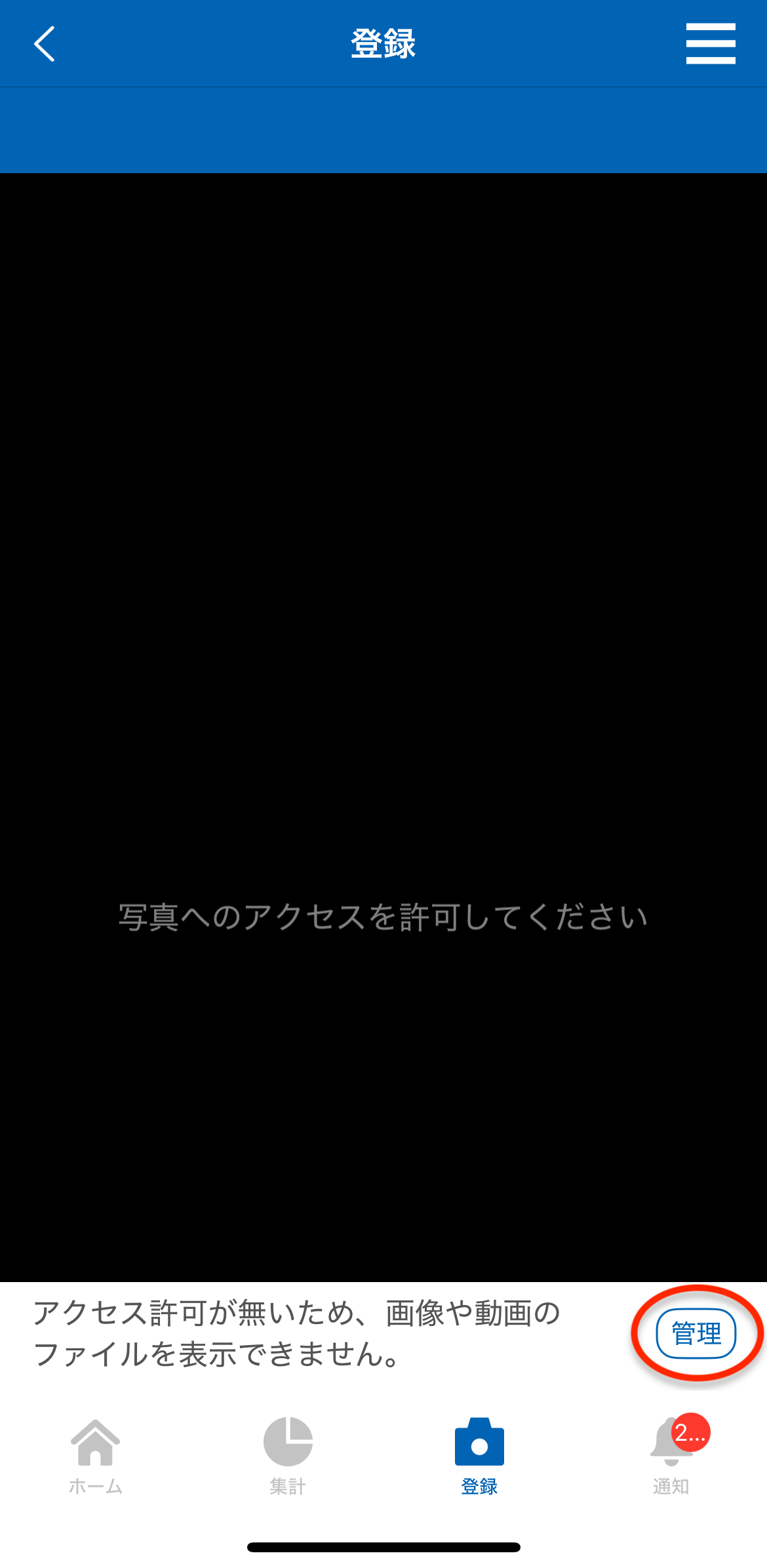 選択可能な写真が表示されない場合は、「管理」をタップし1)2)の手順で登録する写真を選択してください。