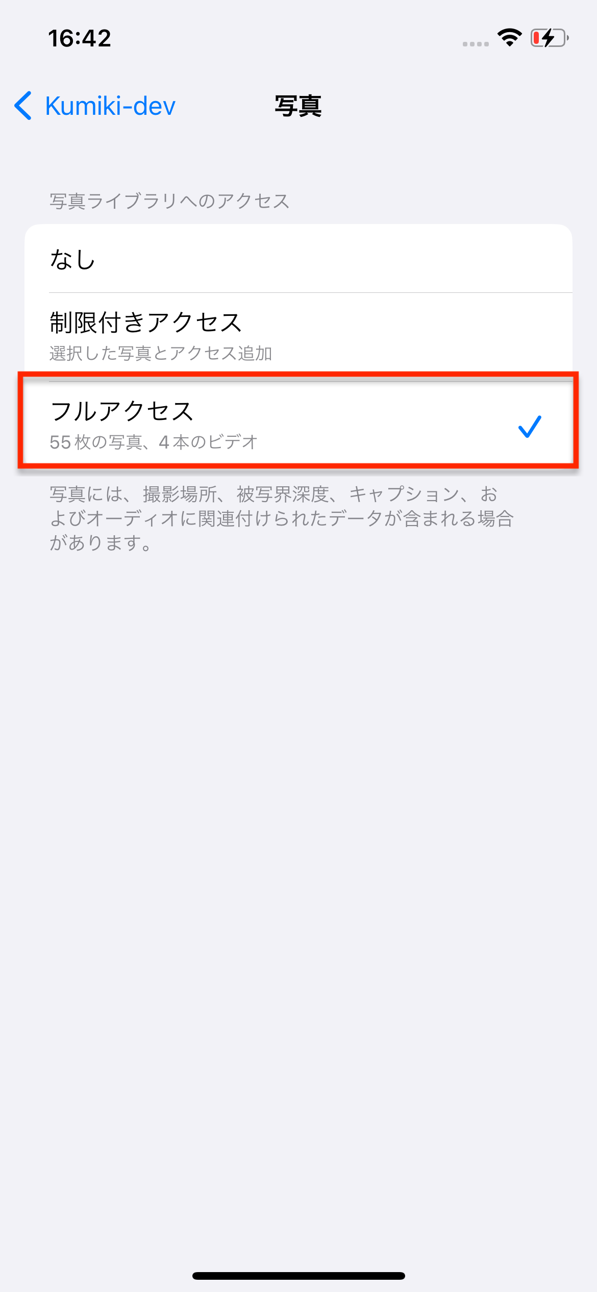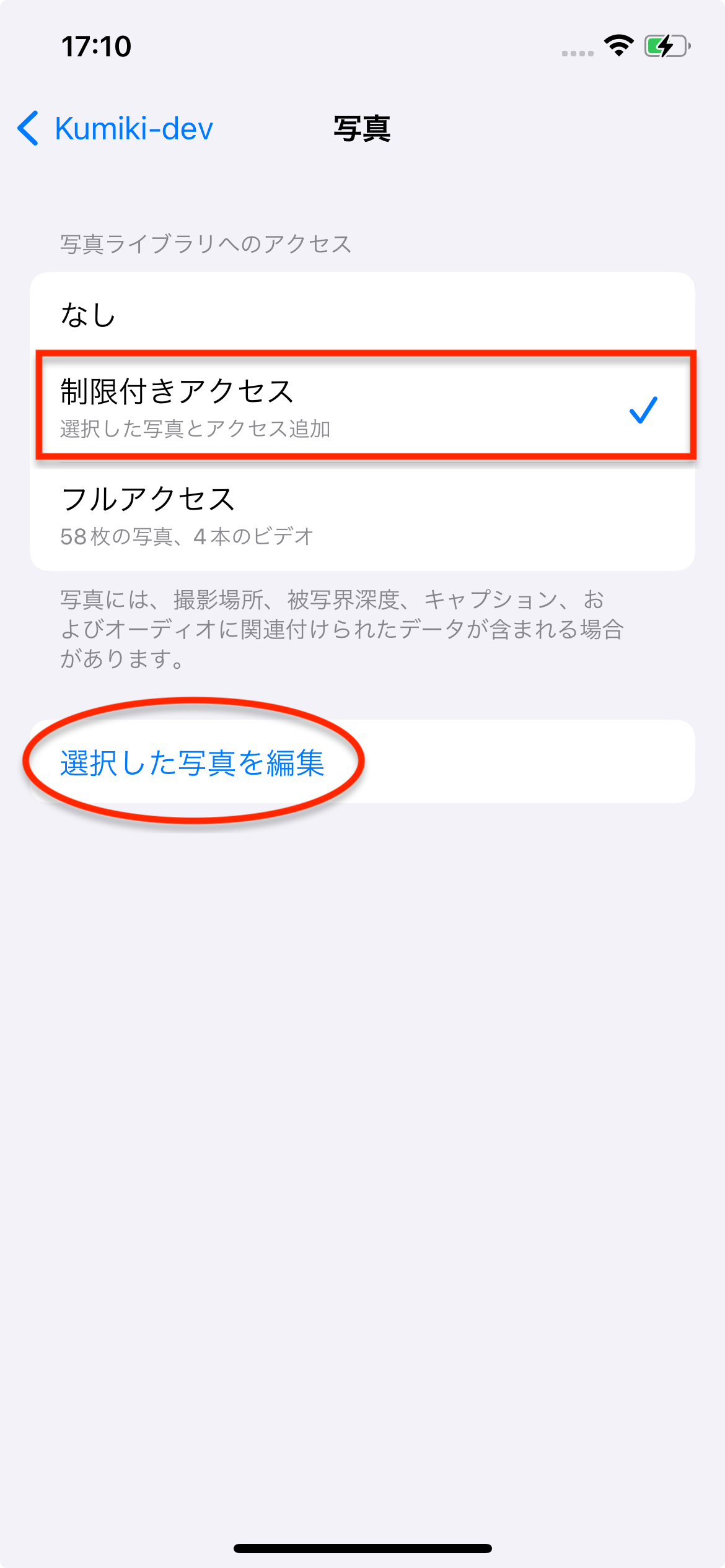 2)写真ライブラリへのアクセスから「フルアクセス」または「制限付きアクセス」を選択してください。