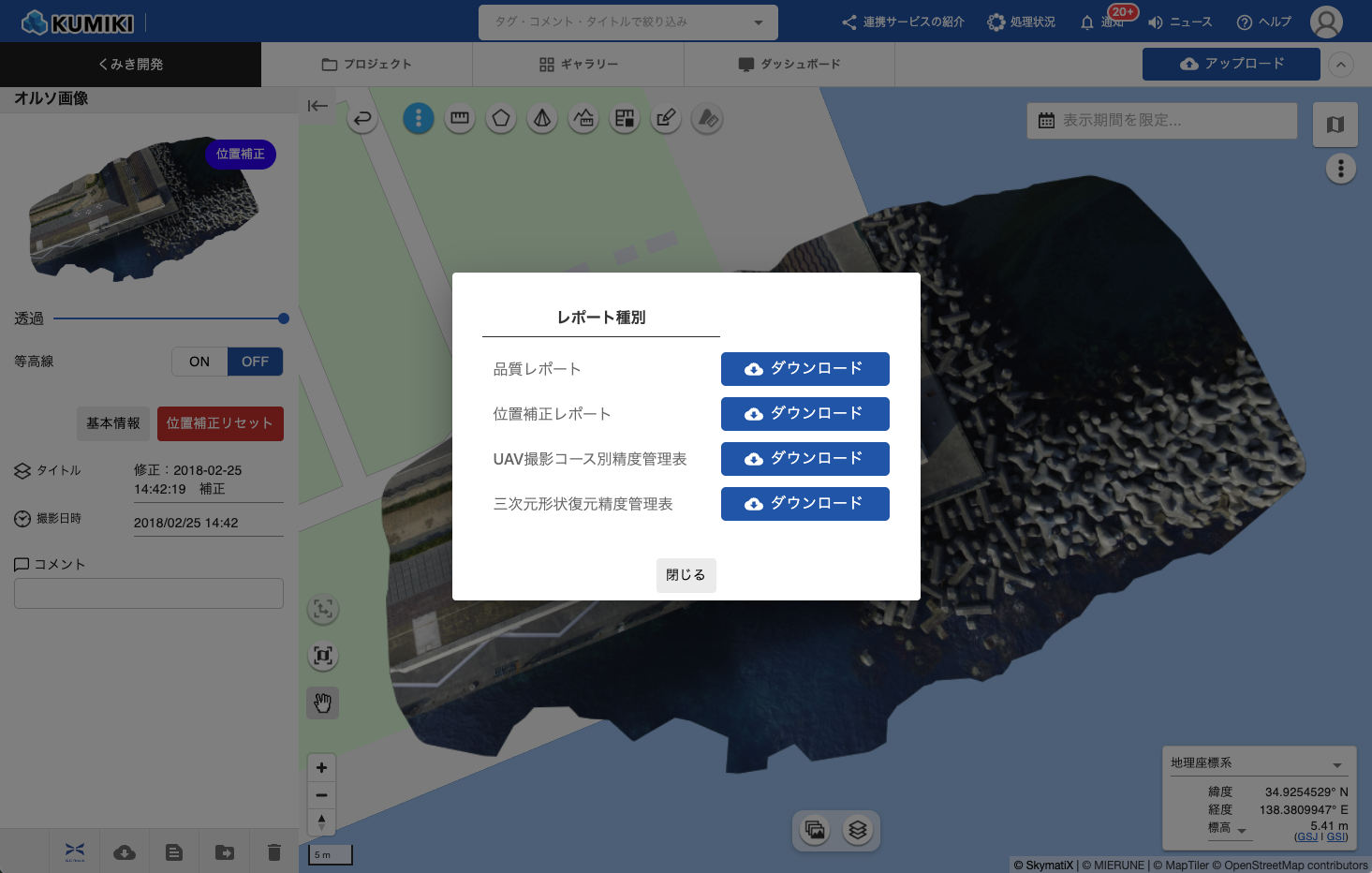 レポートダイアログには、ダウンロード可能なレポートの一覧が表示されます。「UAV撮影コース別精度管理表」の「ダウンロード」ボタンをクリックしてください。