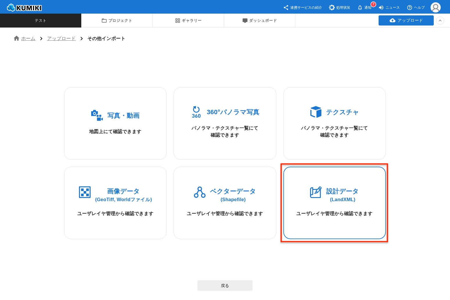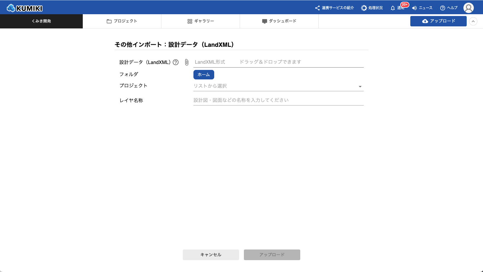 - メインメニューから「アップロード」>「その他インポート」>「設計データ」を選択します。