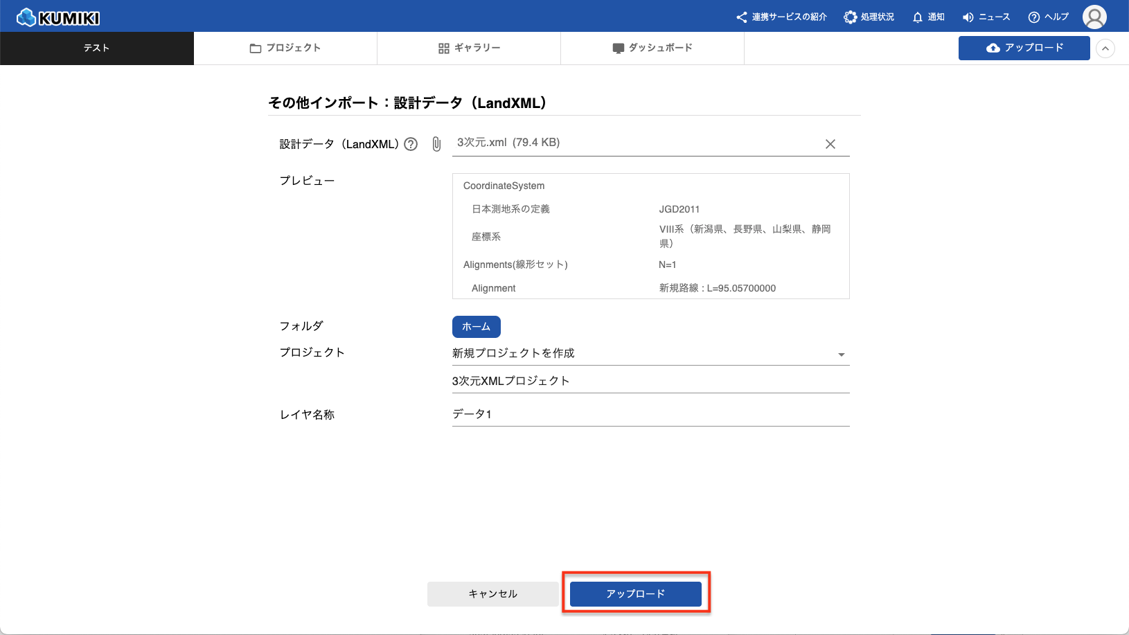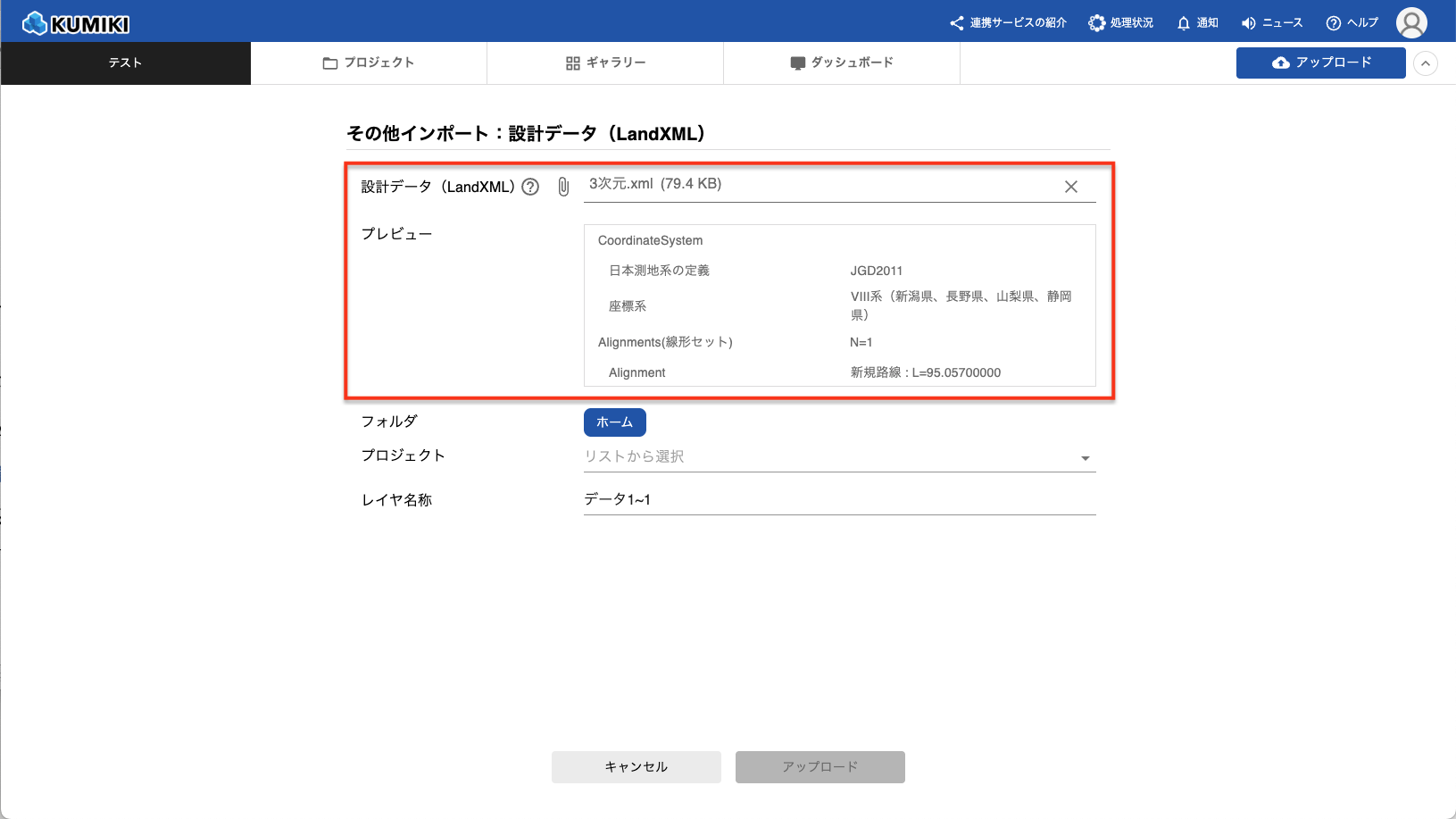 ファイル選択エリアにLandXMLファイルをドラッグ&ドロップするか、クリックしてファイル選択ダイアログを開き、適切なLandXMLファイルを選択します。
