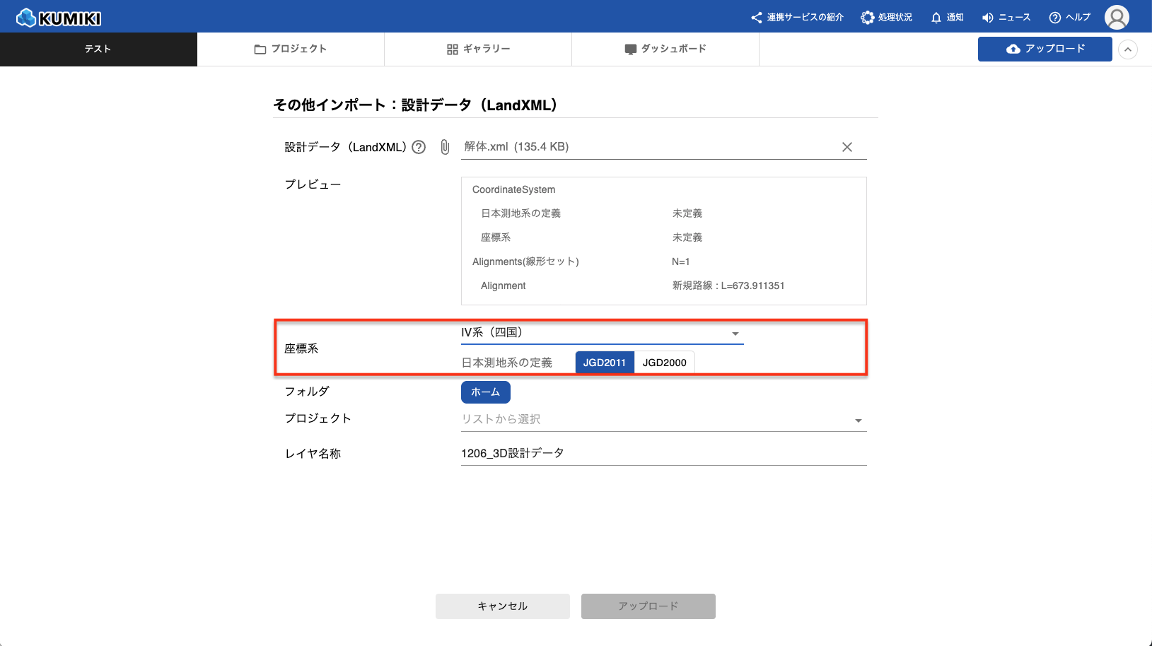 LandXMLファイルにCoordinateSystem(座標系情報)が未定義の場合、座標系ドロップダウンが表示されます。適切な座標系を選択してください。