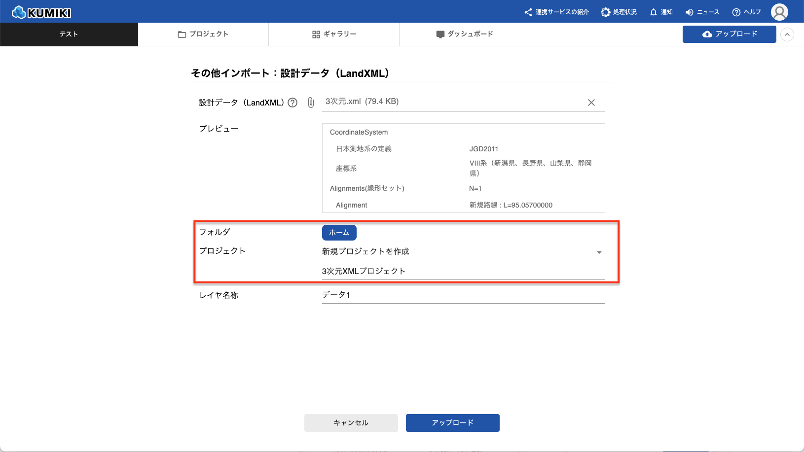 - プロジェクトを指定します(「アップロード」メニューから行なった場合のみ)。
