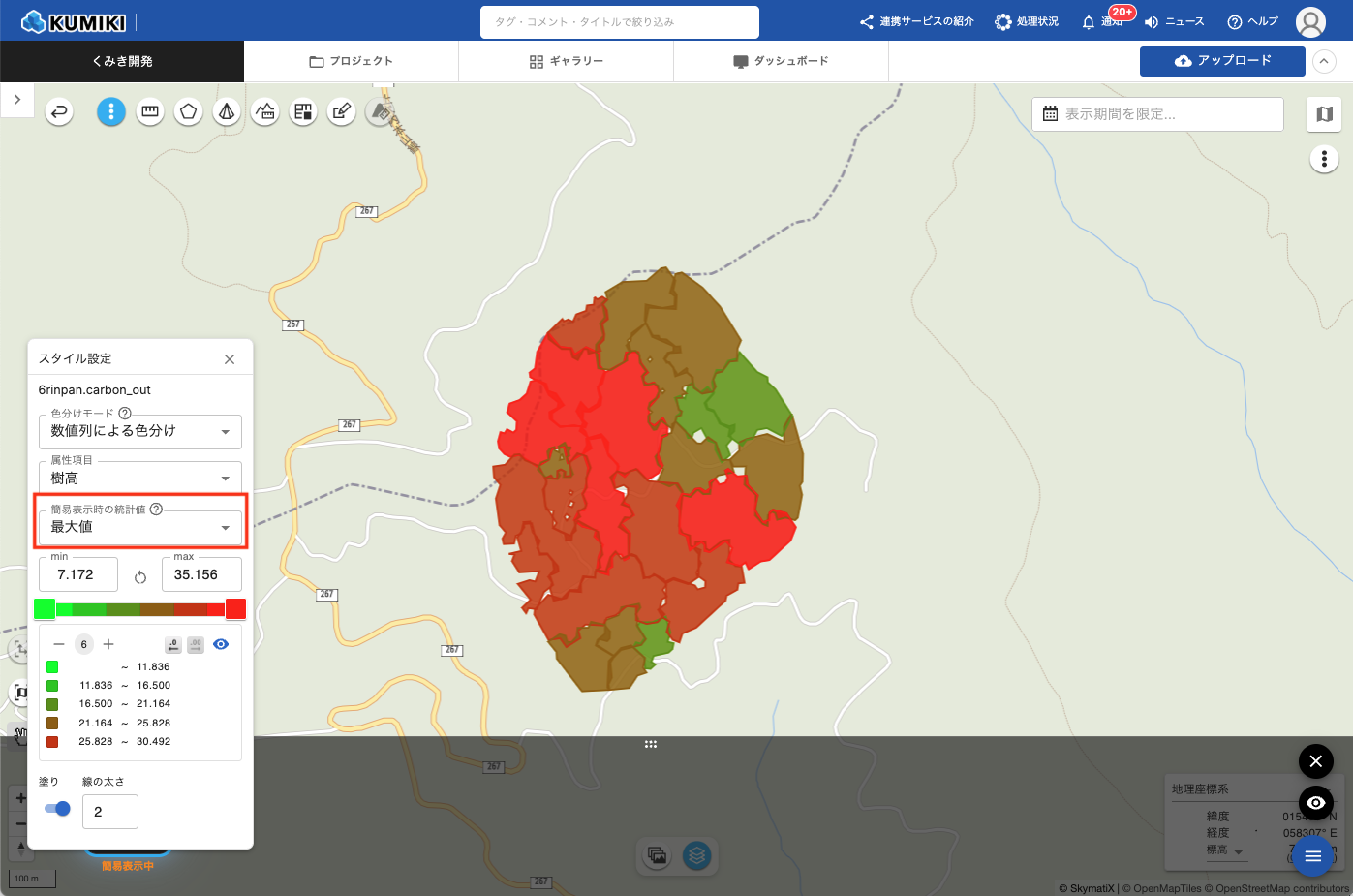 - 「簡易表示時の統計値」プルダウンから、地図を縮小してデータが集約表示される際の色分け基準を選択します。