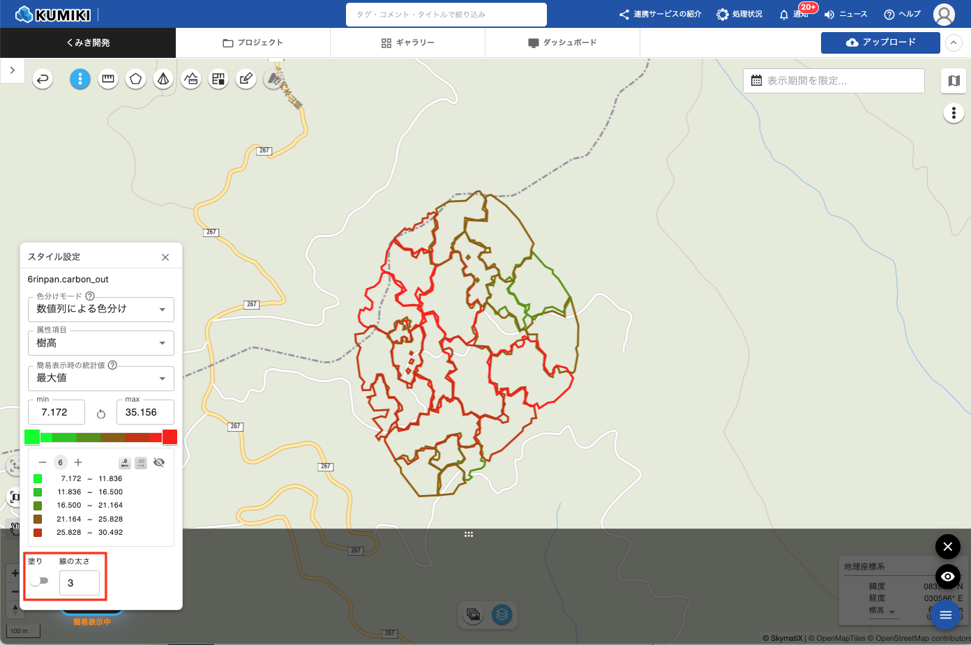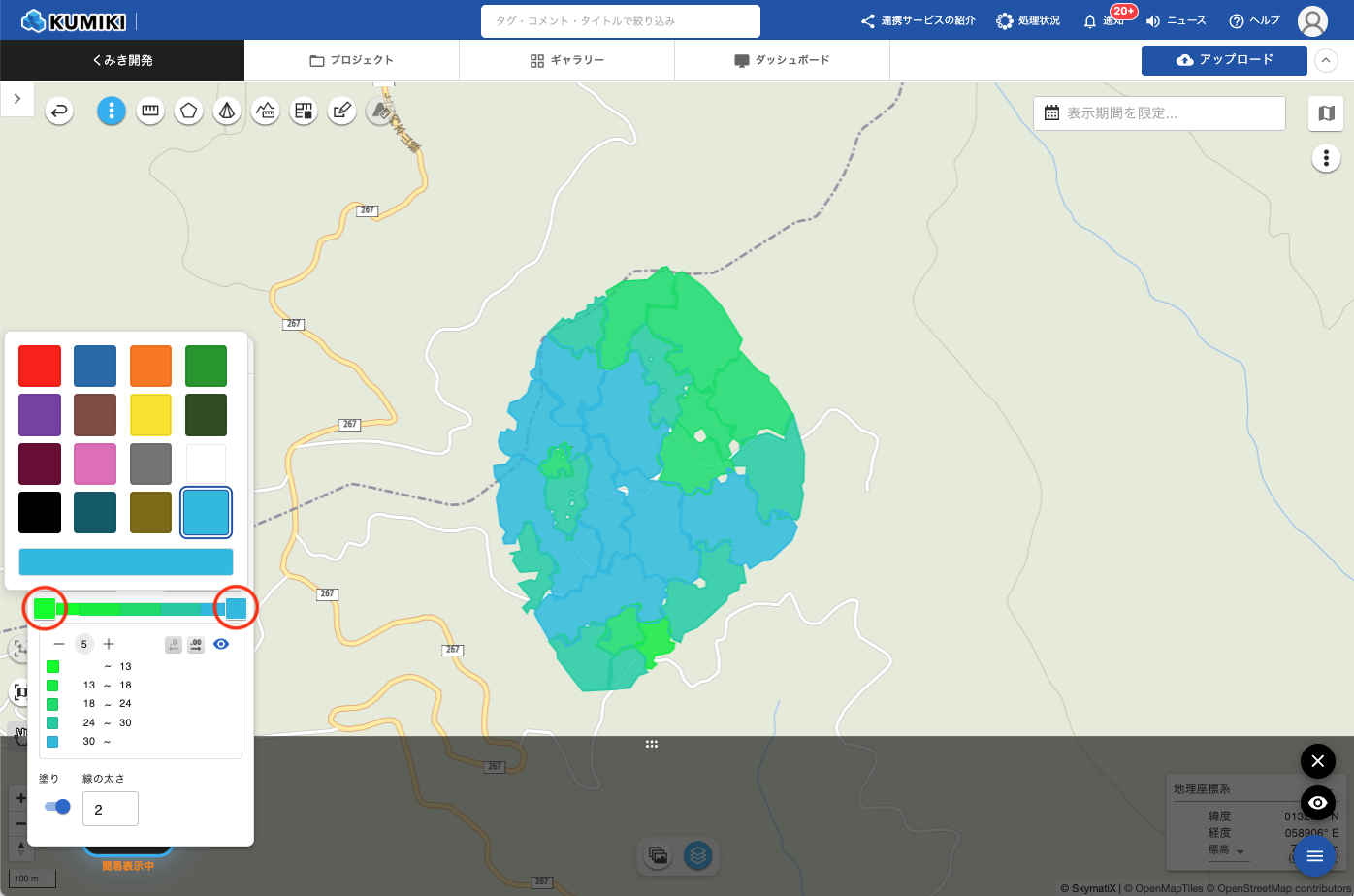 色を変更すると、グラデーションバーおよび地図上の色分けがリアルタイムで更新されます。
