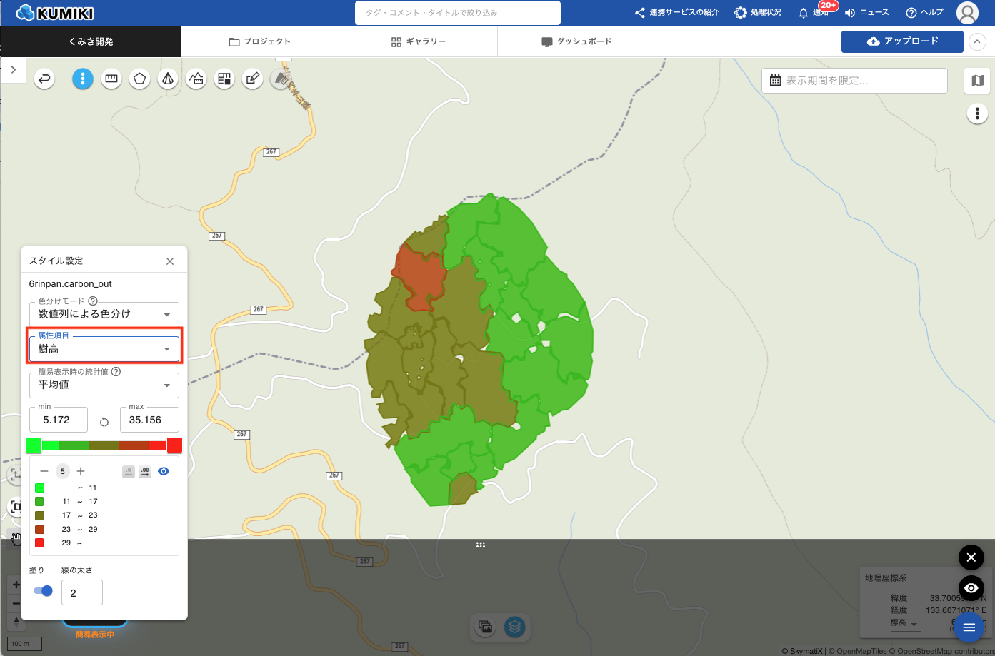 - 色分けモードを「数値列による色分け」に変更する