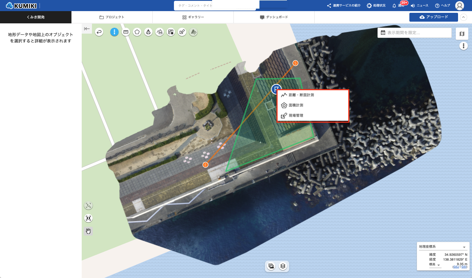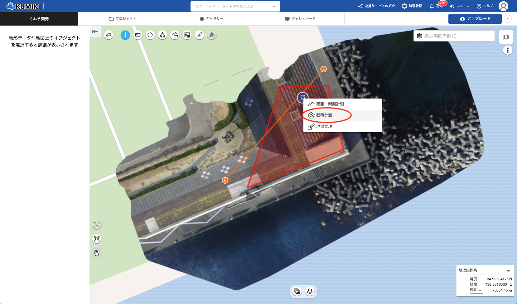 距離・断面計測、簡易計測、面積計測、体積計測、土量計測など、地図上で計測を行った結果が対象となります。 - その他のコンテンツ