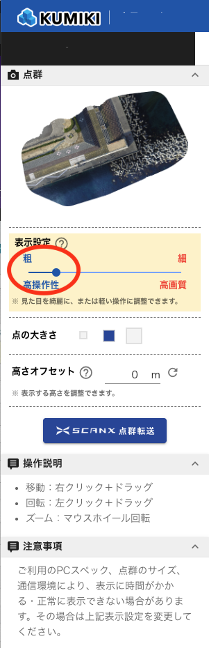 3D点群で計測エラーとなる 2025年12月19日 00:44 更新 3D点群で計測エラーが起きた場合は、ご利用のパソコンのメモリ不足が原因です。こちらをお試しください。 表示設定を左「粗・高操作性」へスライドさせ再度お試しください。 ブラウザで複数のタブを開いている場合は、不要なタブを閉じてください。 動作環境をご確認ください。 (エラーメッセージ例)(表示設定) 関連記事 操作説明書 ユーザーの種別とは ダッシュボードが「取得中」のままで正しく表示されない ログインする テクスチャをインポートする