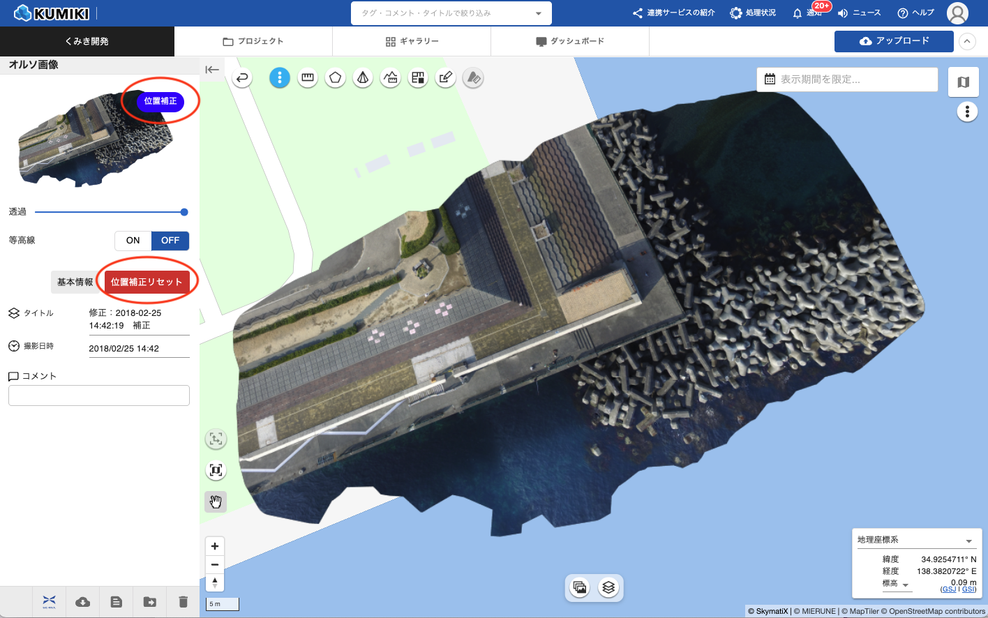 - 位置補正をリセットすると、関連するダウンロードデータ(オルソ、DSM、点群、等高線など)は有効期限内であっても削除されます。必要なデータは事前にダウンロードしておくことをお勧めします。
