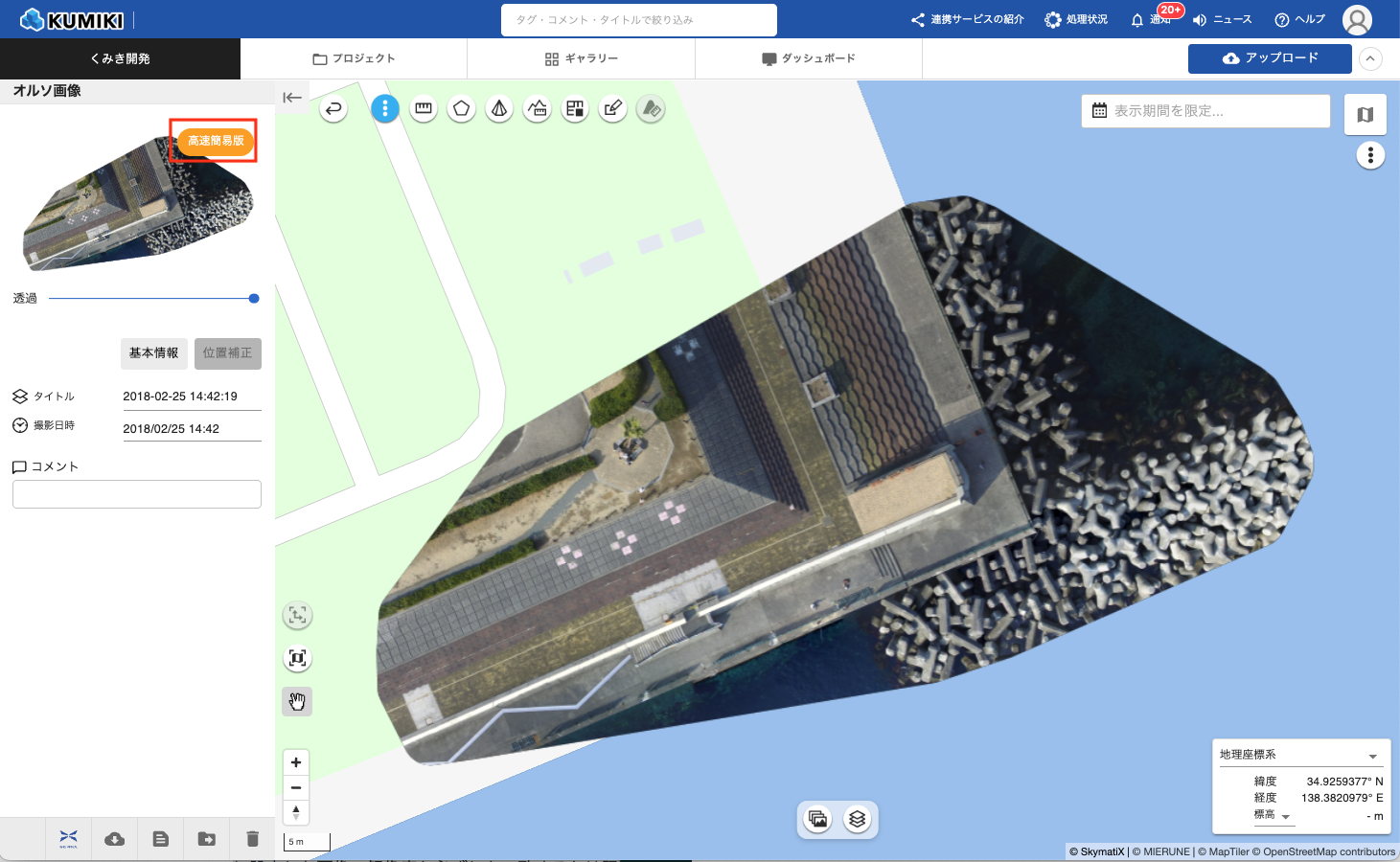 高速簡易オルソが作成されると通知され、プロジェクト詳細画面サムネイル右上に「高速簡易版」と表示されます。通常版が作成されると同じく通知され、「高速簡易版」表示が消えます。