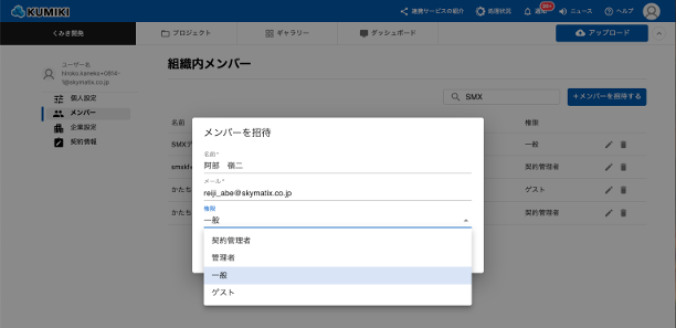 (ユーザーの追加は契約管理者または管理者で操作いただく必要がございます。)