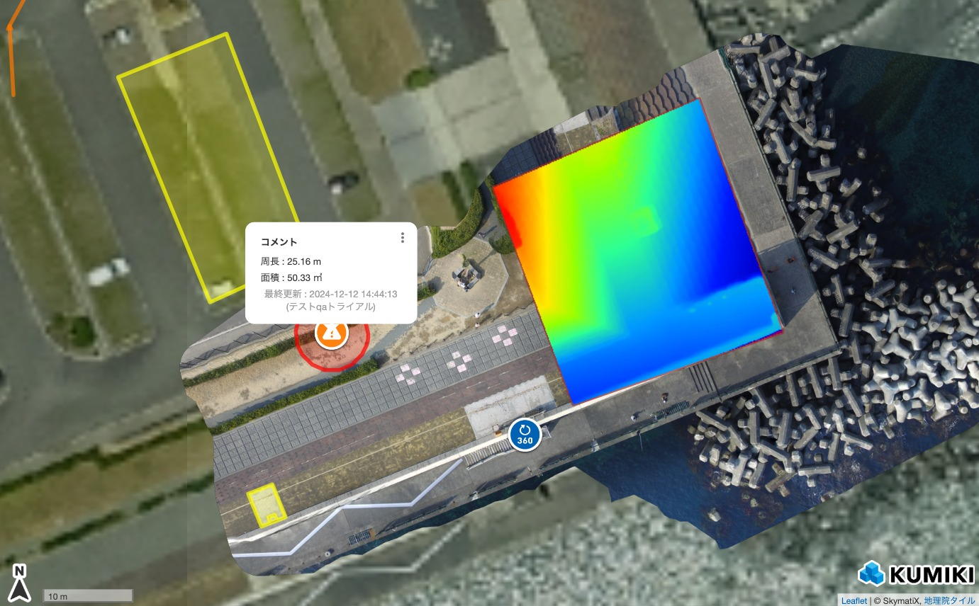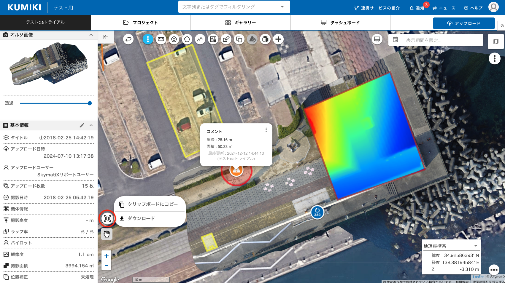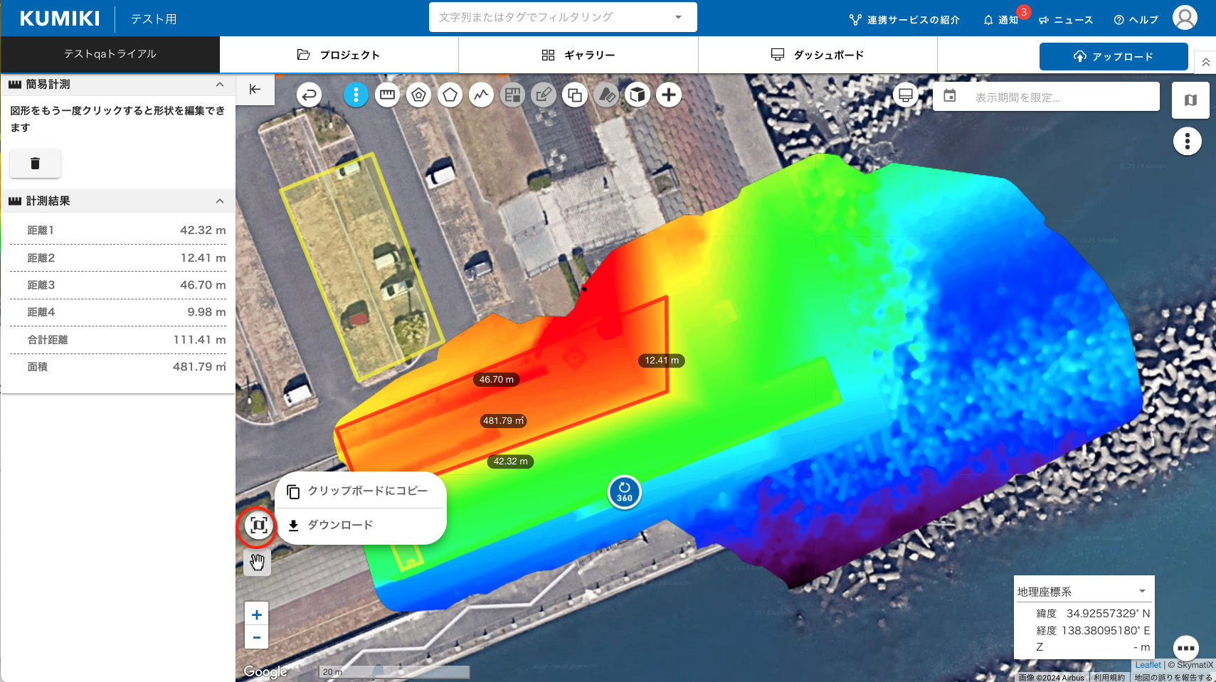 地図(オルソ、DSM)表示中のキャプチャを取得し「クリップボードにコピー」または「ダウンロード」を実行できます。