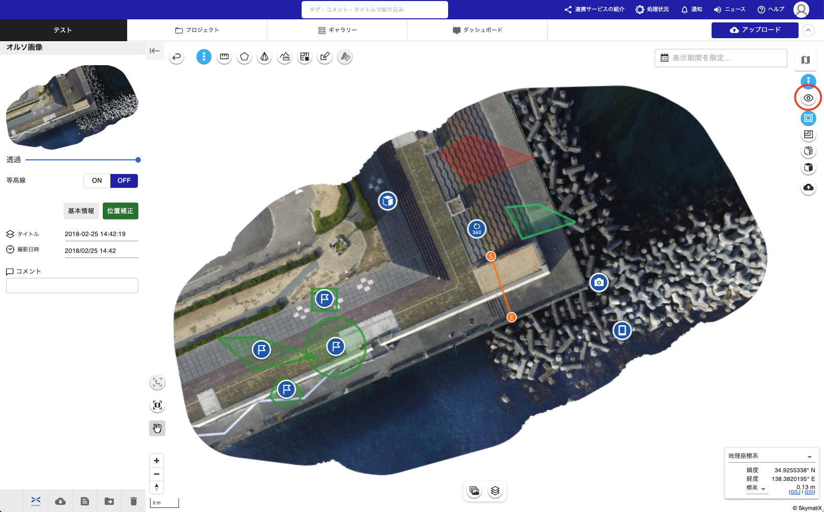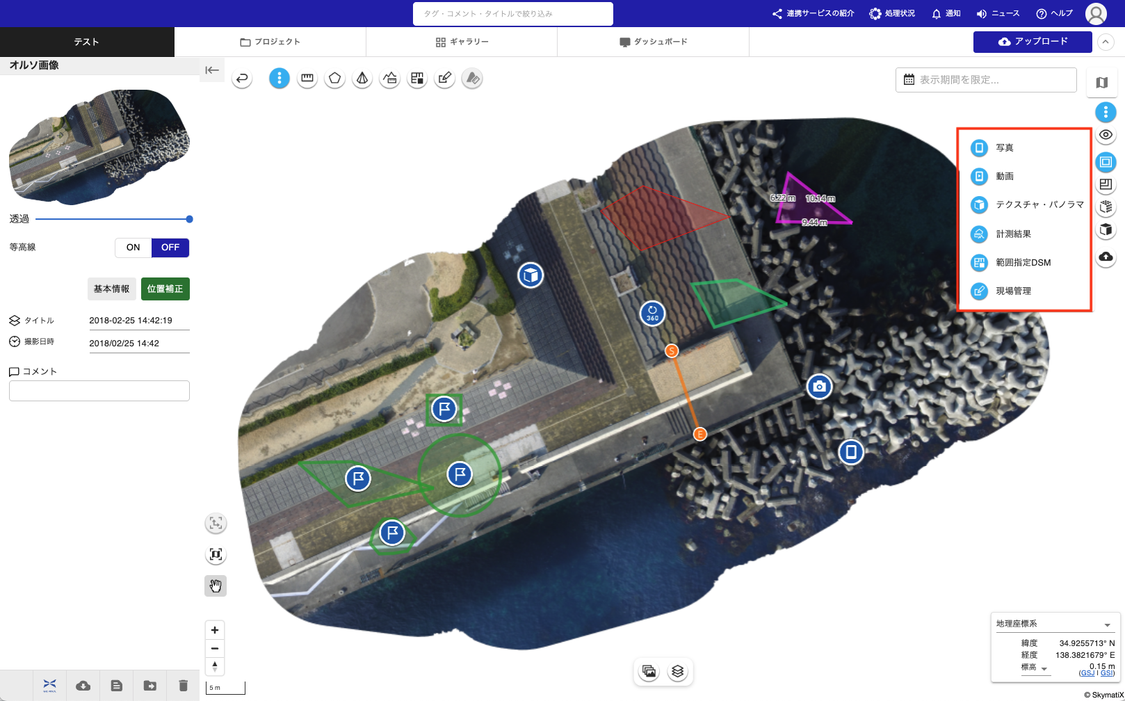 プロジェクト詳細画面では、地図上に表示されるコンテンツ(写真、動画、計測結果など)の表示・非表示を切り替えることができます。この機能を使用することで、必要なコンテンツのみを地図上に表示し、作業効率を向上させることができます。