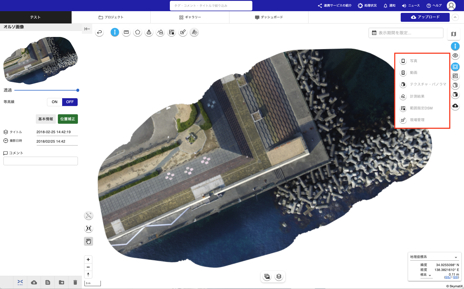 - メニュー内に表示されているコンテンツ種類(写真、動画、テクスチャ・パノラマ、計測結果、範囲指定DSM、現場管理)の中から、表示・非表示を切り替えたい項目をクリックします。