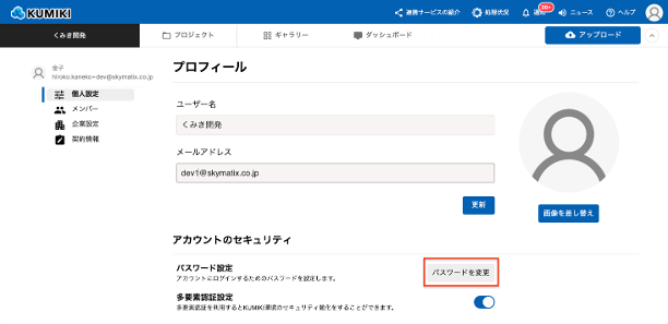2.左側メニュー「個人設定」を開き、「パスワードを変更」をクリックします。