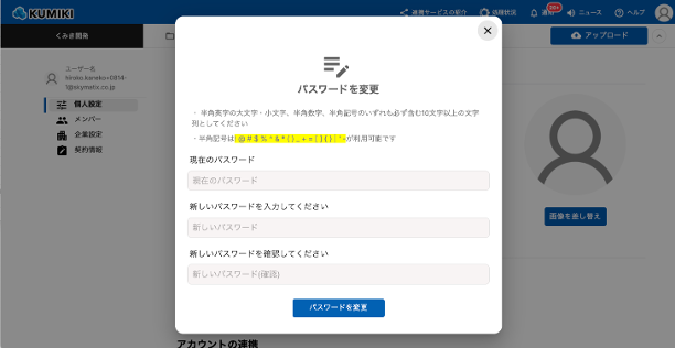 - 半角英字の大文字・小文字、半角数字、半角記号のいずれも必ず含む10文字以上とすること。