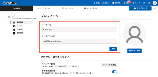 登録しているメールアドレスの変更方法を教えてください 2025年08月28日 04:55 更新 1.トップ画面の右上アイコンから「マイアカウント」をクリックします。 2.左側メニュー「個人設定」を開き、メールアドレスを変更して「更新」ボタンをクリックします。 関連記事 斜め撮影とは、どのように撮影すれば良いですか? どのように撮影すれば良いですか? 企業の名称・メールアドレスを編集したい 権限によってどのような操作ができますか 多要素認証の設定方法を教えてください