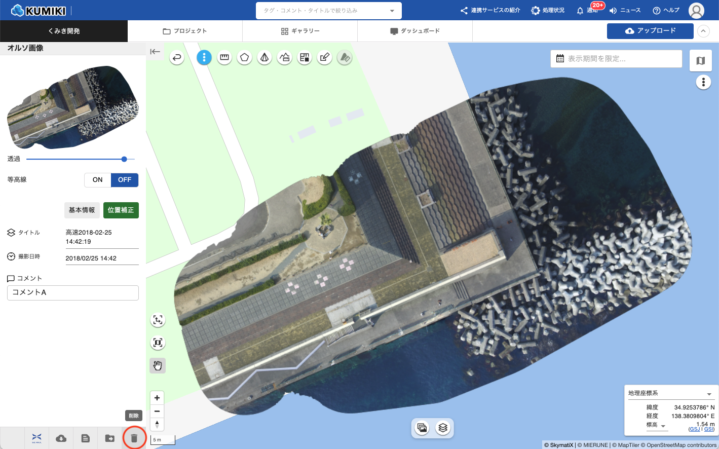プロジェクト詳細画面で、削除したい地形データを選択します。- 削除ボタンをクリックする