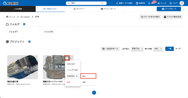 - プロジェクト(︙)>任意座標系>設定をクリックします。