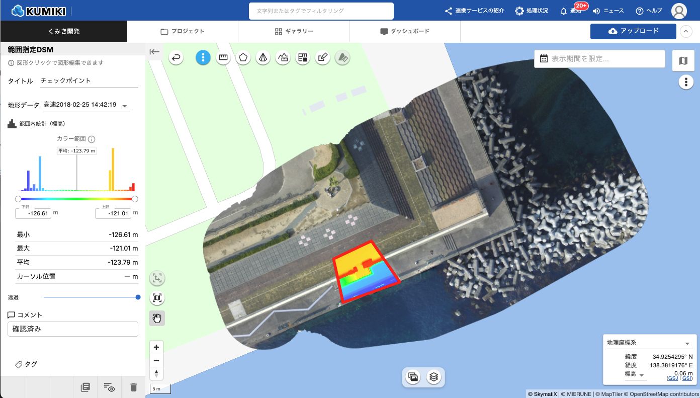 地形データを選択すると、その地形データの標高値に基づいてカラーグラデーションが地図上に表示されます。 - 範囲内統計の確認