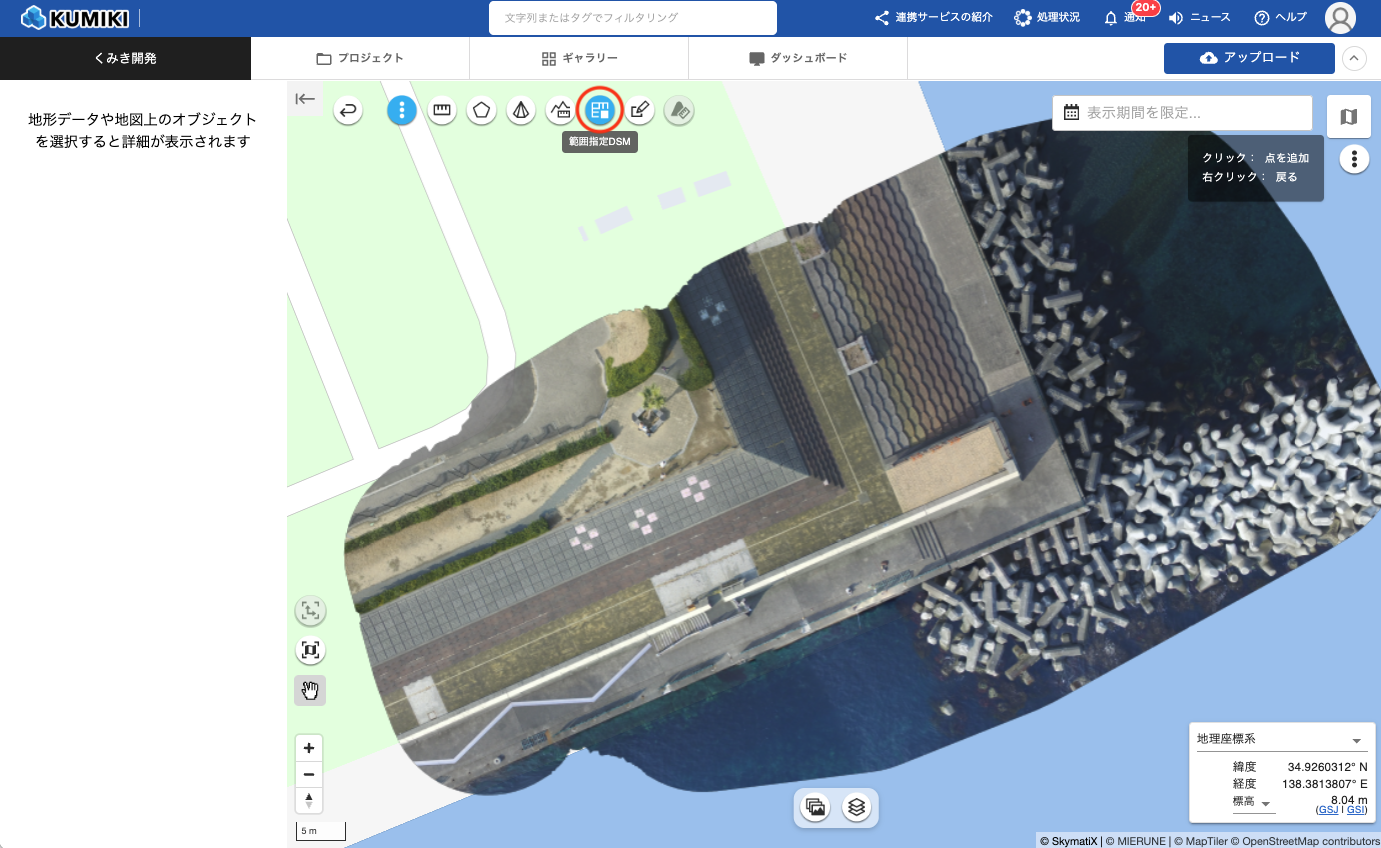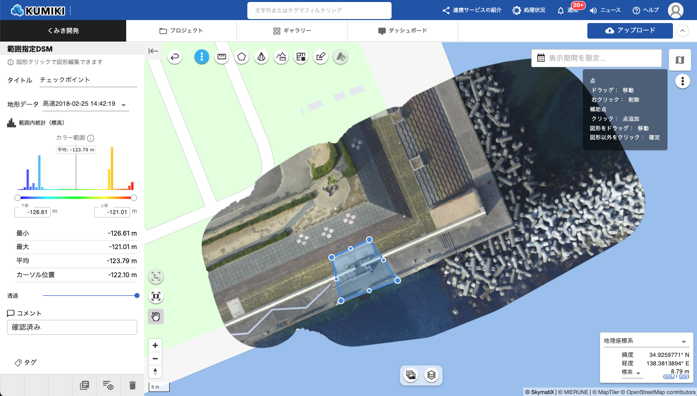 3点以上の頂点を指定した後、最初の頂点(始点)をクリックするとポリゴンが閉じられ、範囲指定DSMが作成されます。