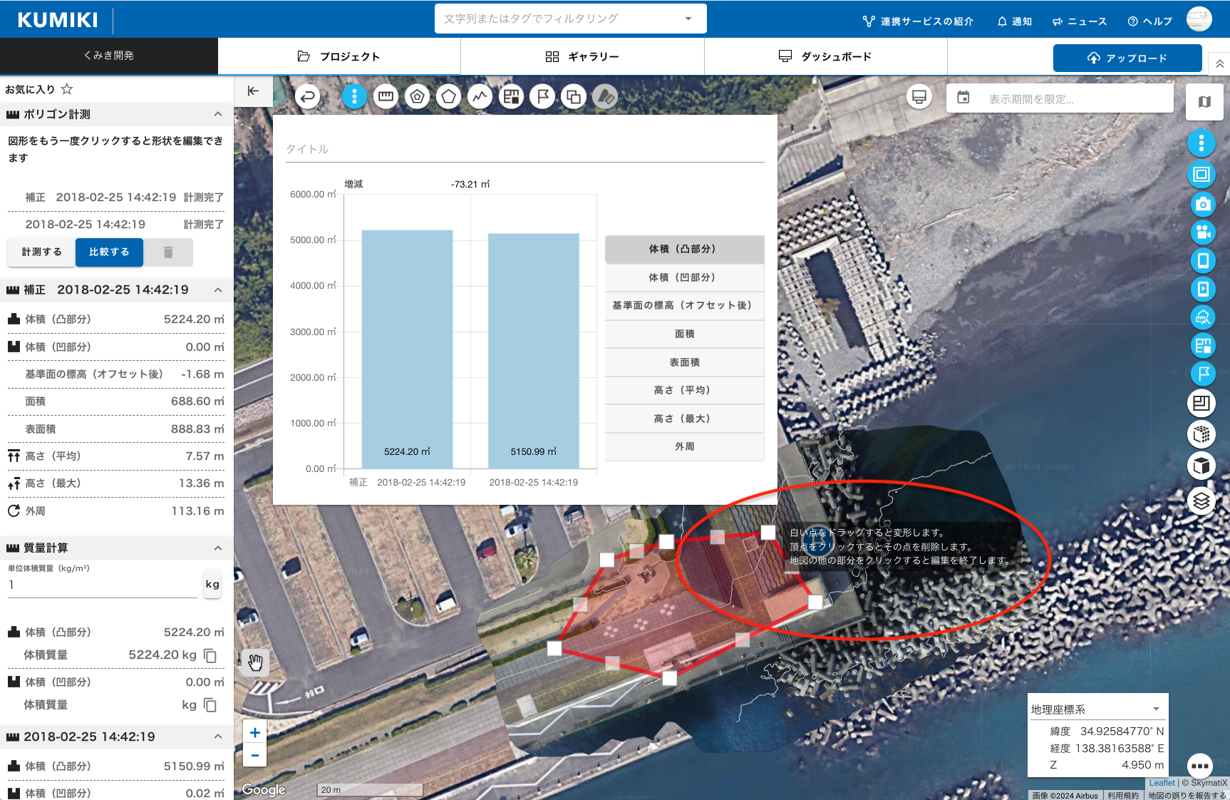 同じ現場を複数回撮影し、その体積差を計測したいときは、オルソ・DSMの「ポリゴン計測」を利用します。