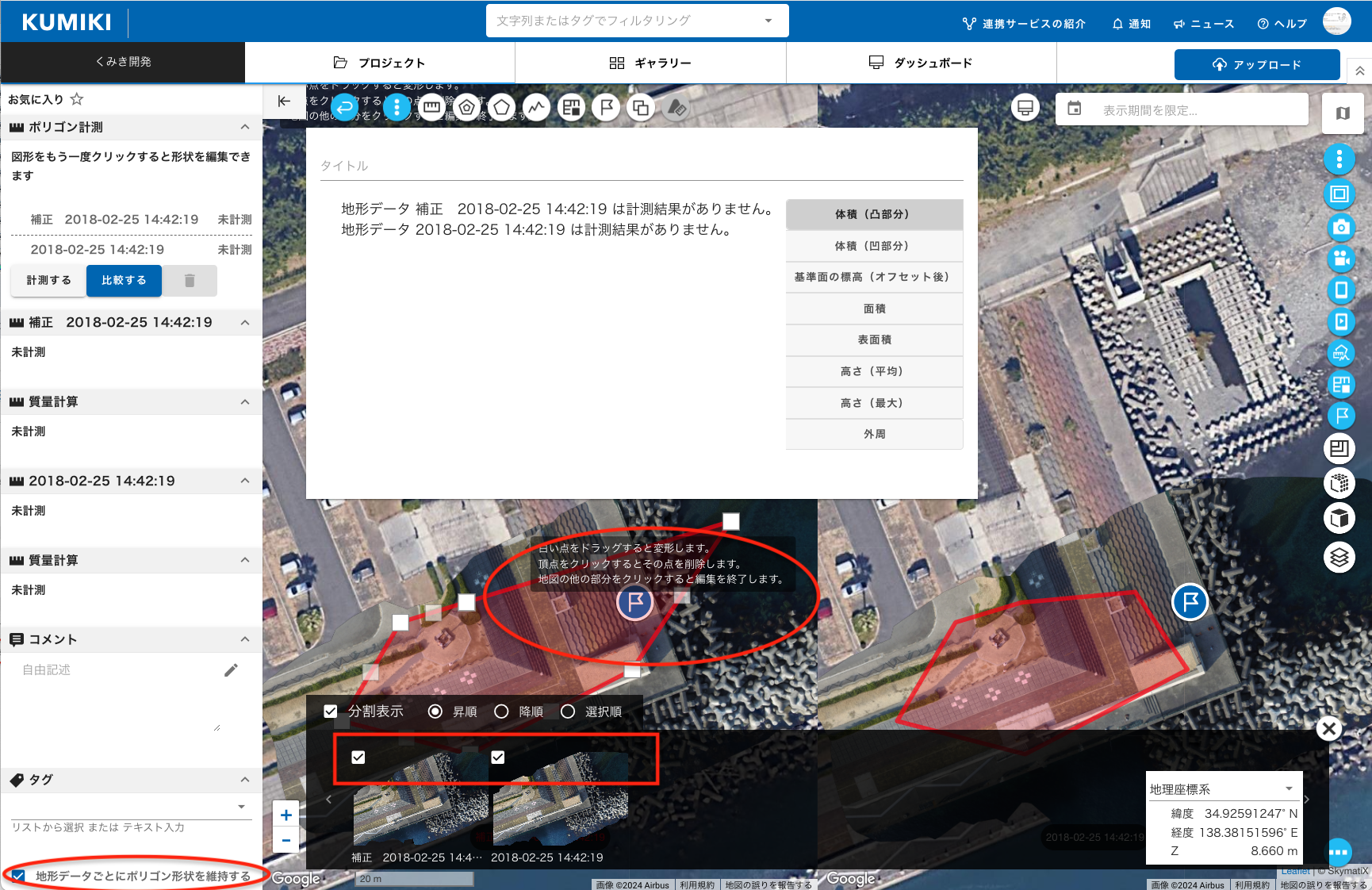 複数地形データそれぞれで個別の形状で計測を行いたい場合は、複数地形データを選択した状態で「地形データごとにポリゴン形状を維持する」をチェックします。修正する地形データ上の形状の編集を行います。