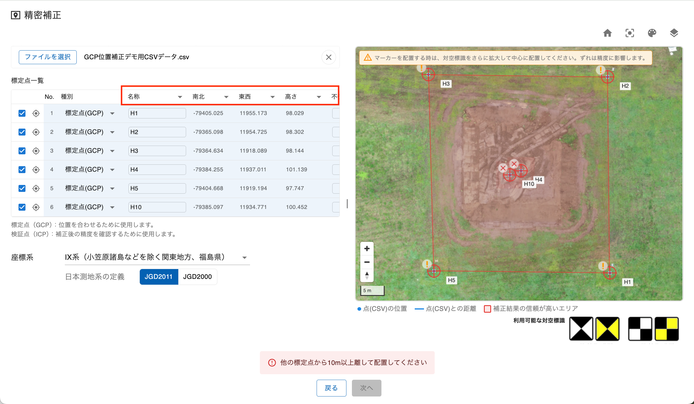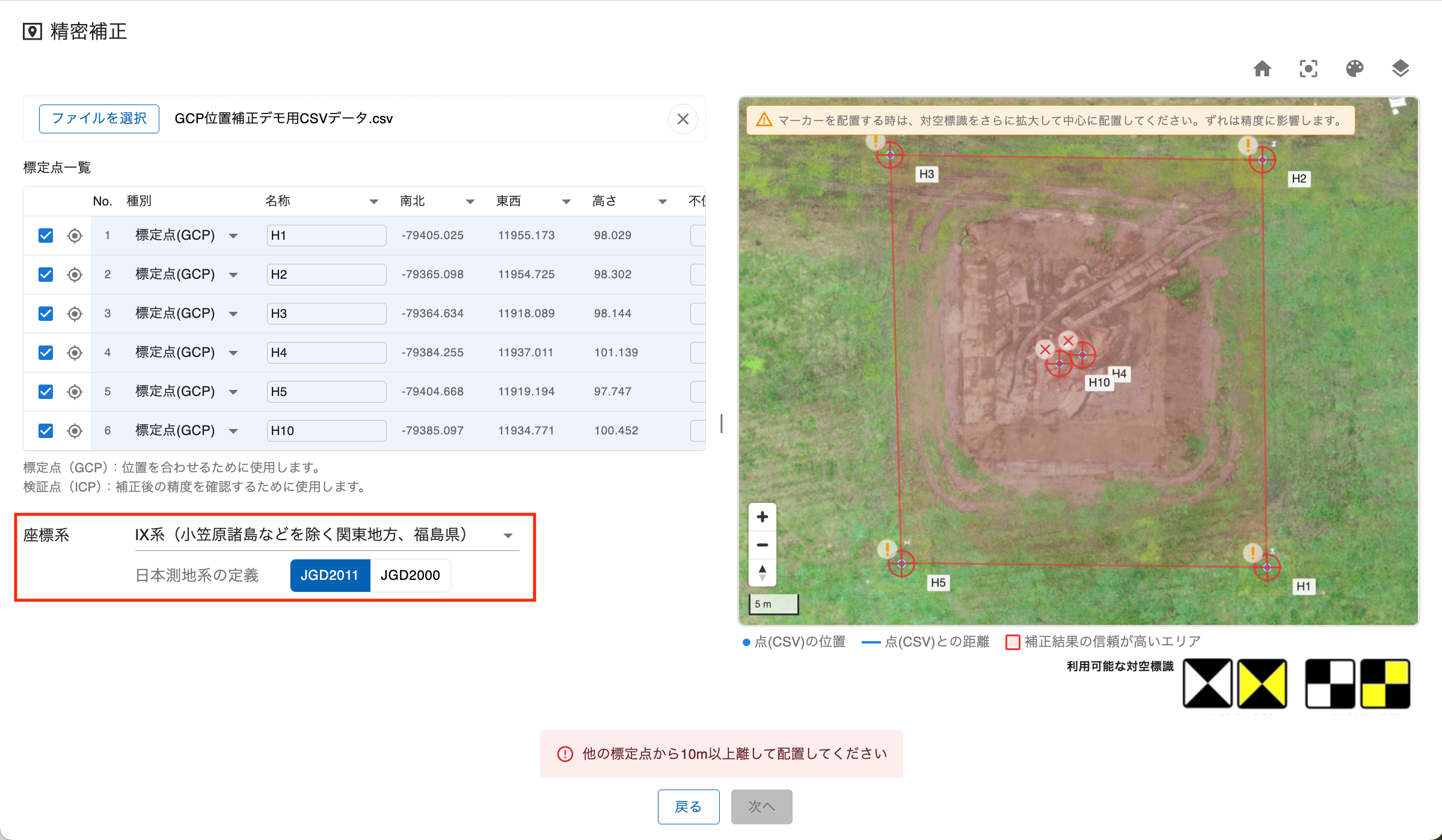 - 右パネルの地図上には「補正結果の信頼が高いエリア」がポリゴンで表示されます。標定点はこのエリア内に配置することをお勧めします。