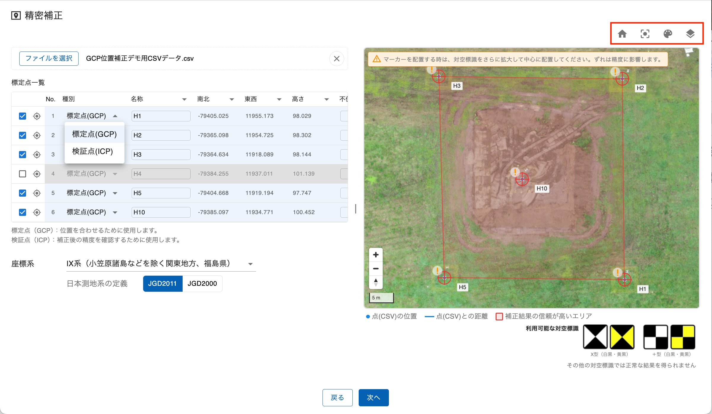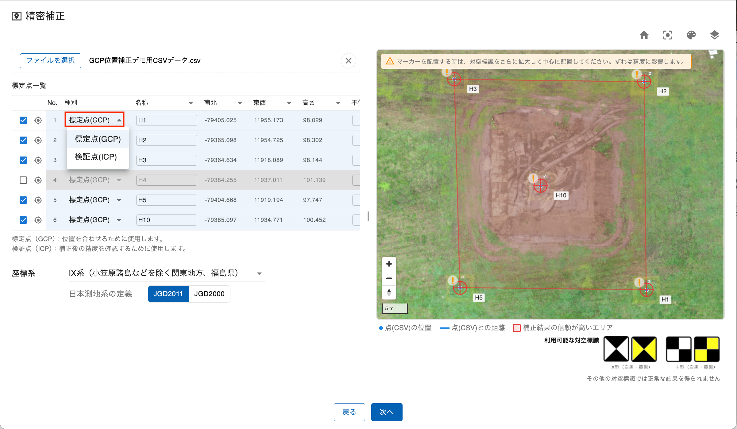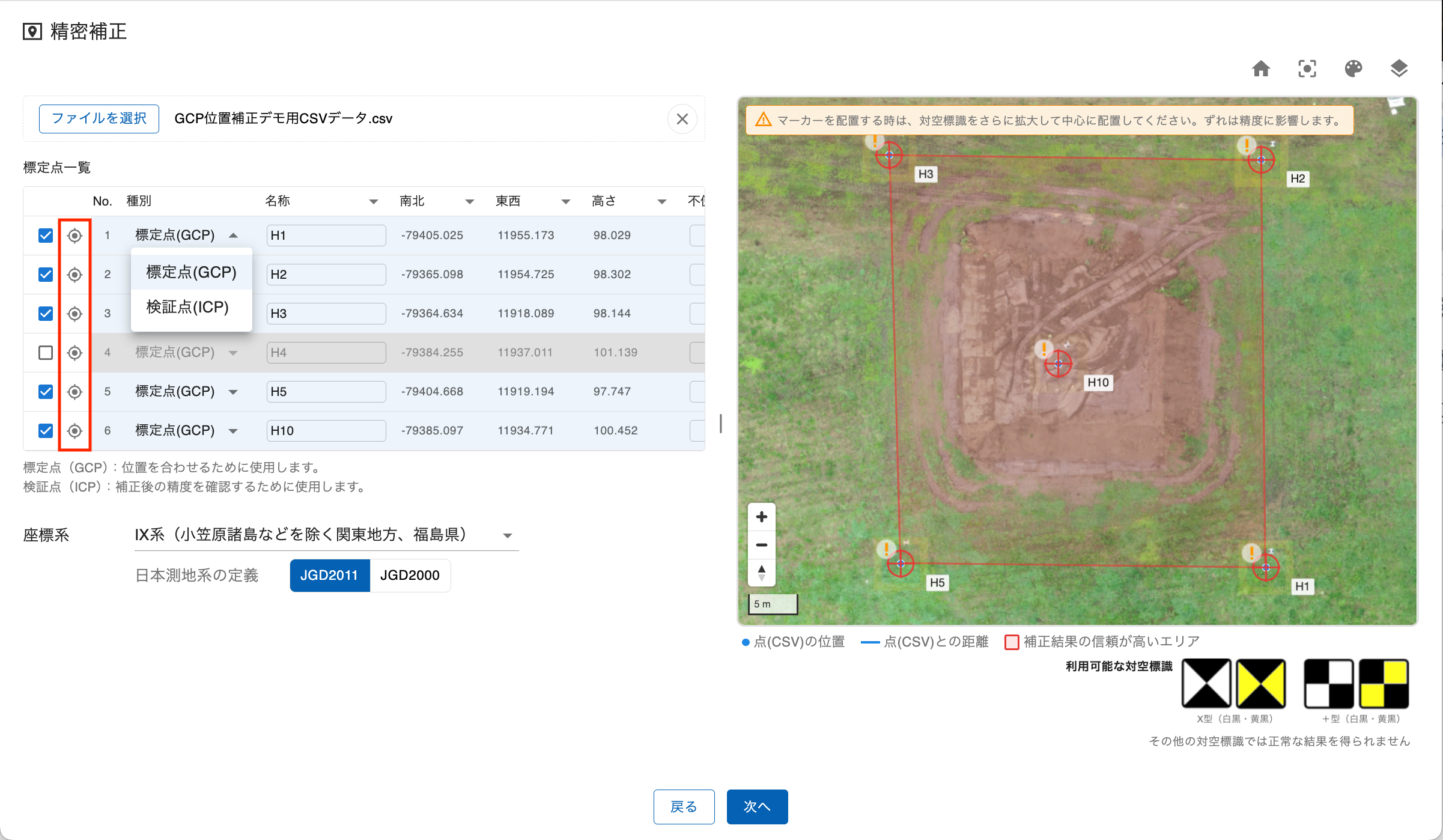 - 「種別」列のプルダウンメニューから、各点を「標定点(GCP)」または「検証点(ICP)」に設定できます。