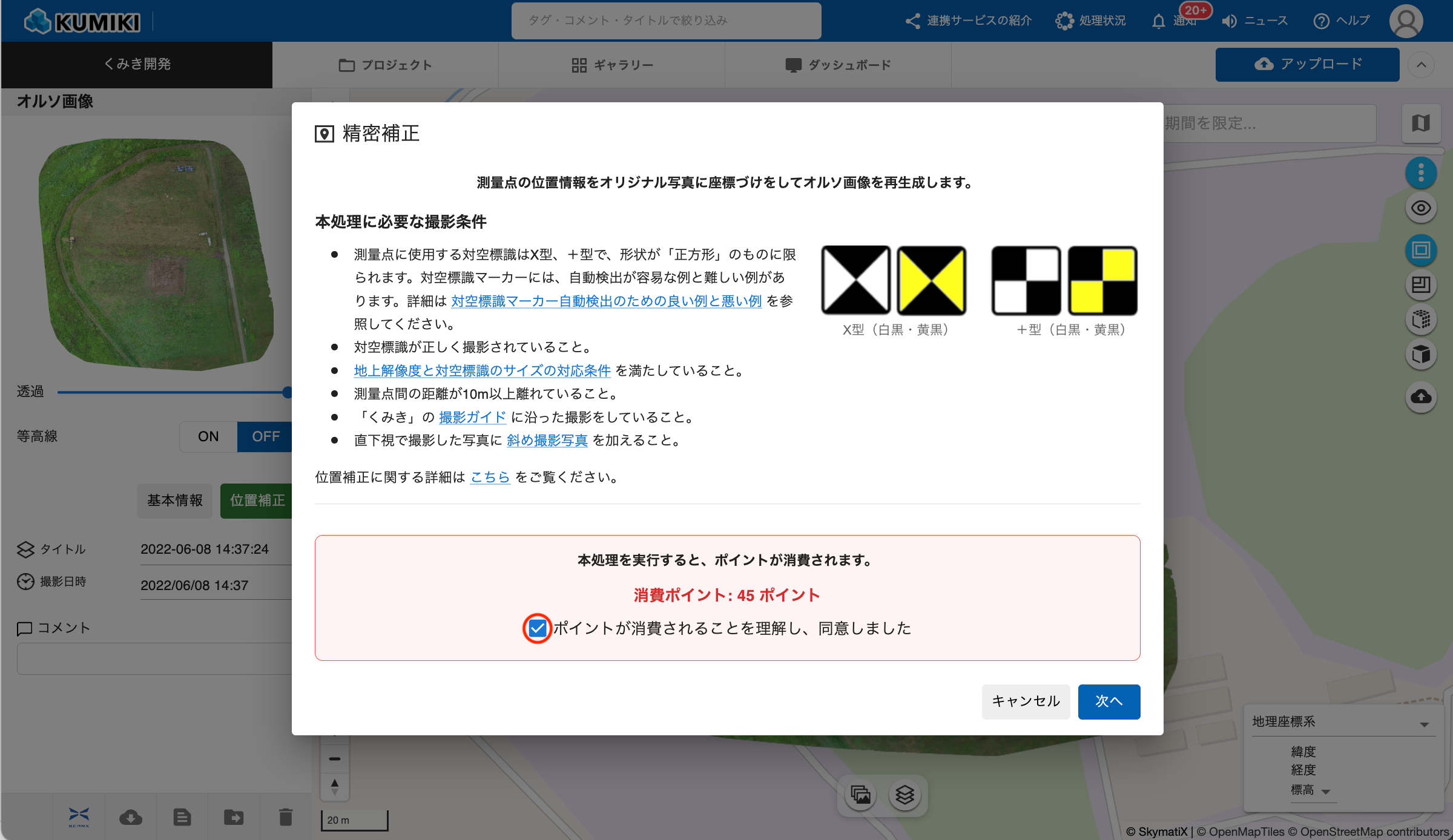 - 精密補正の場合は、利用可能な対空標識(X型・+型、外周が四角)の画像が表示されます。これらの対空標識以外のものを利用している場合は正常な処理ができませんのでご注意ください。