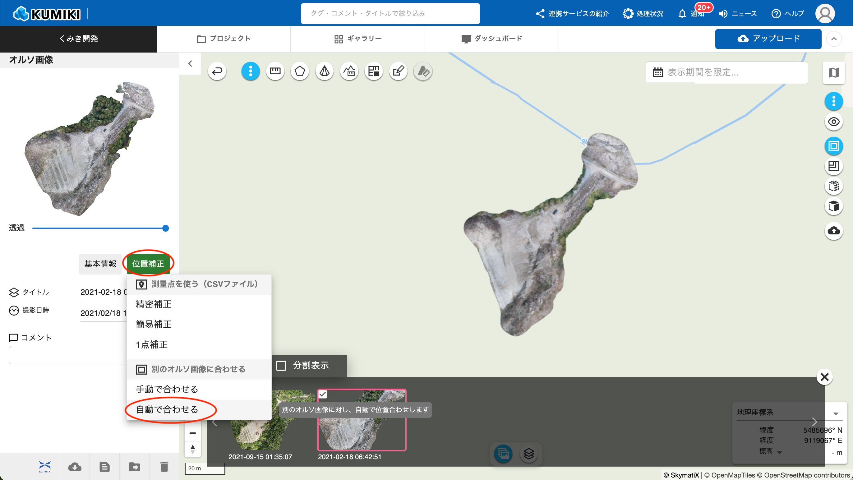 - メニュー内の「別のオルソ画像に合わせる」グループにある「自動で合わせる」をクリックします。