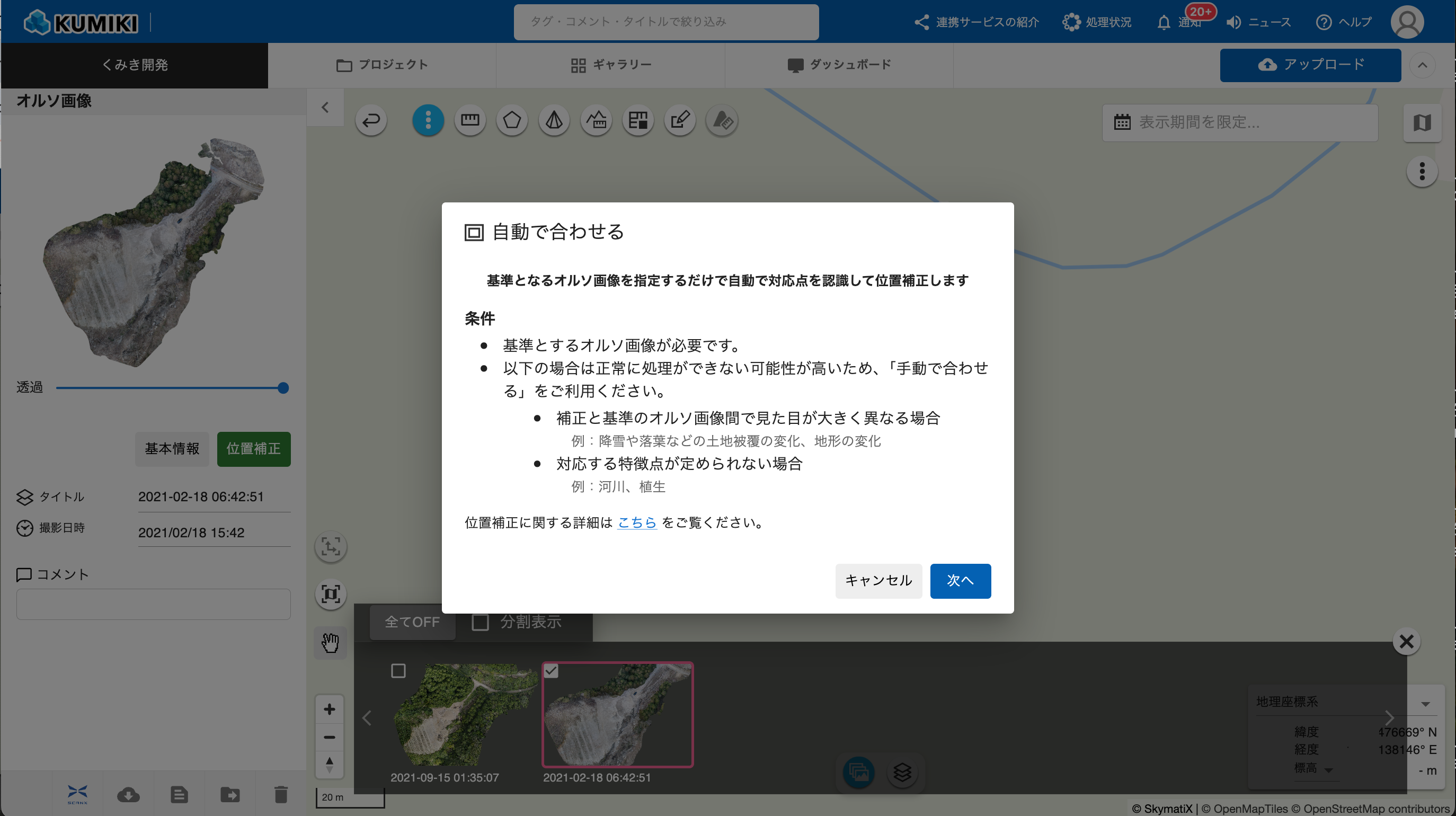 - 補正対象のオルソ画像と基準のオルソ画像の撮影範囲が90%以上重なっている必要があります