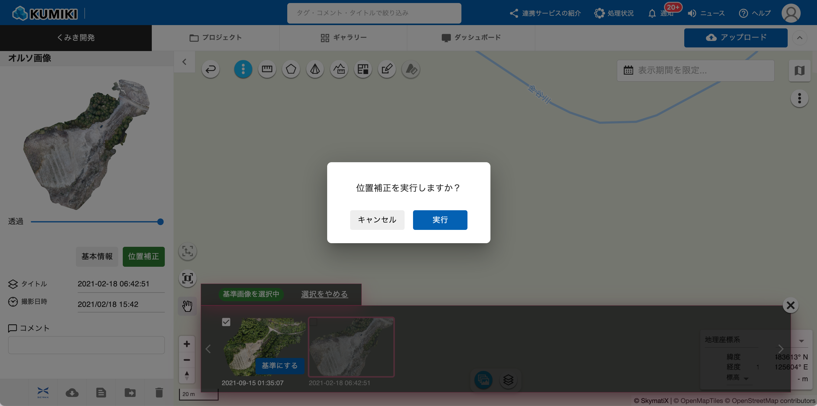 - 基準画像を選択すると、「位置補正を実行しますか?」という確認ダイアログが表示されます。