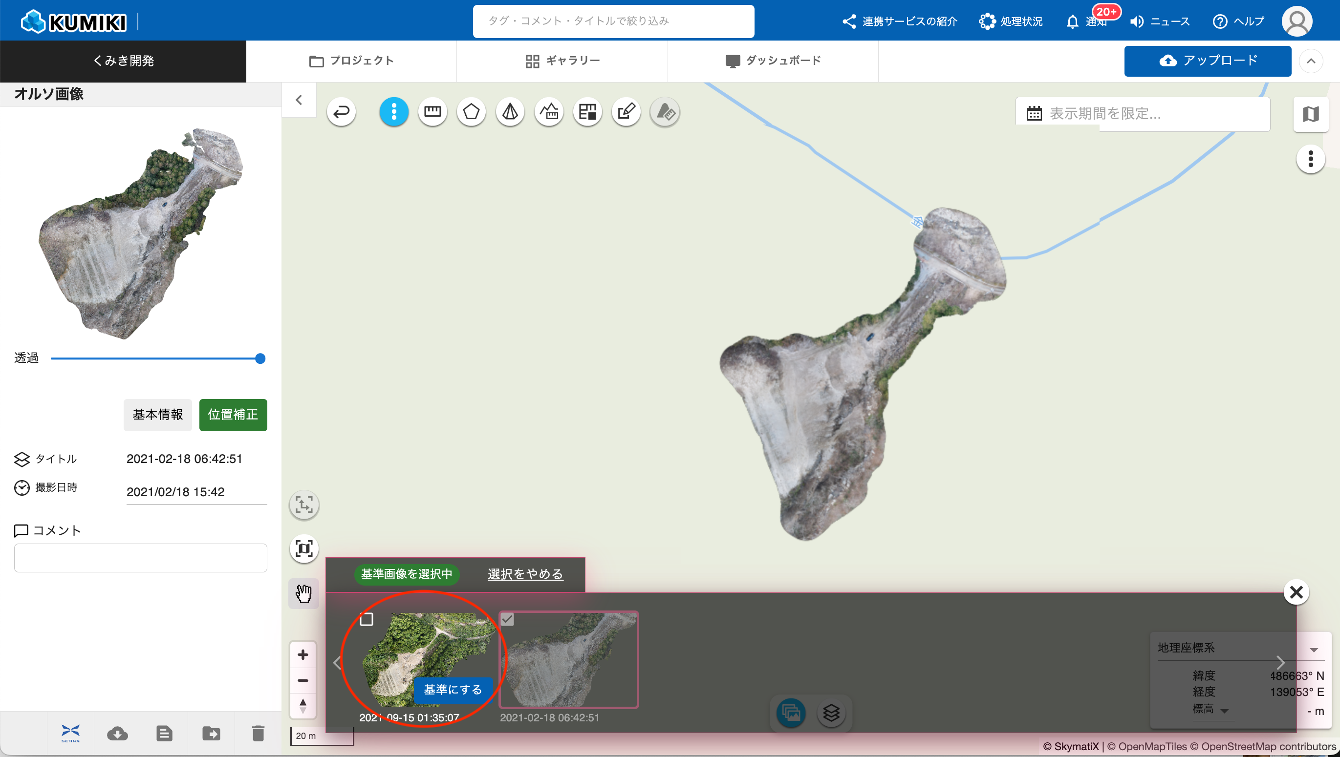- 基準に選択可能なオルソ画像のサムネイル上に「基準にする」ボタンが表示されます。基準にしたいオルソ画像の「基準にする」ボタンをクリックしてください。