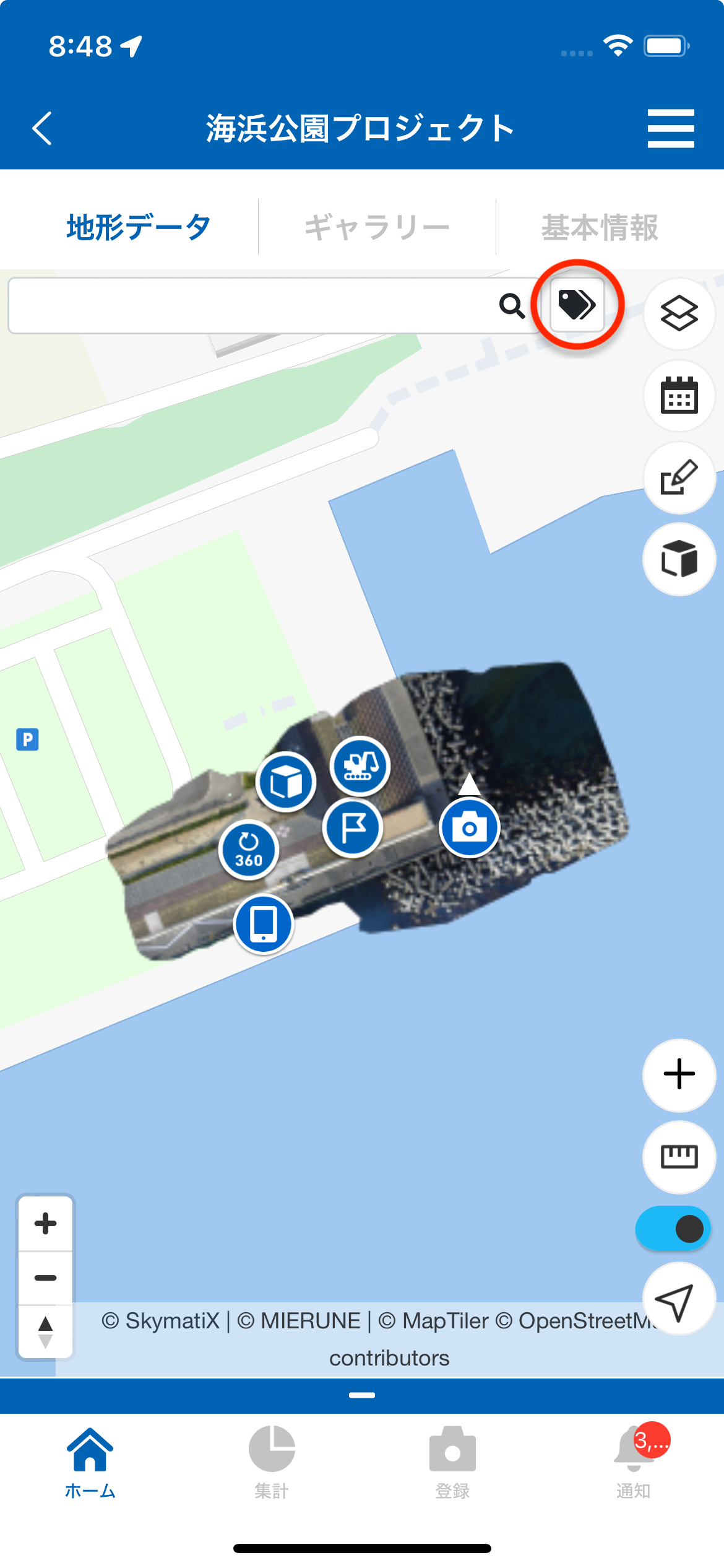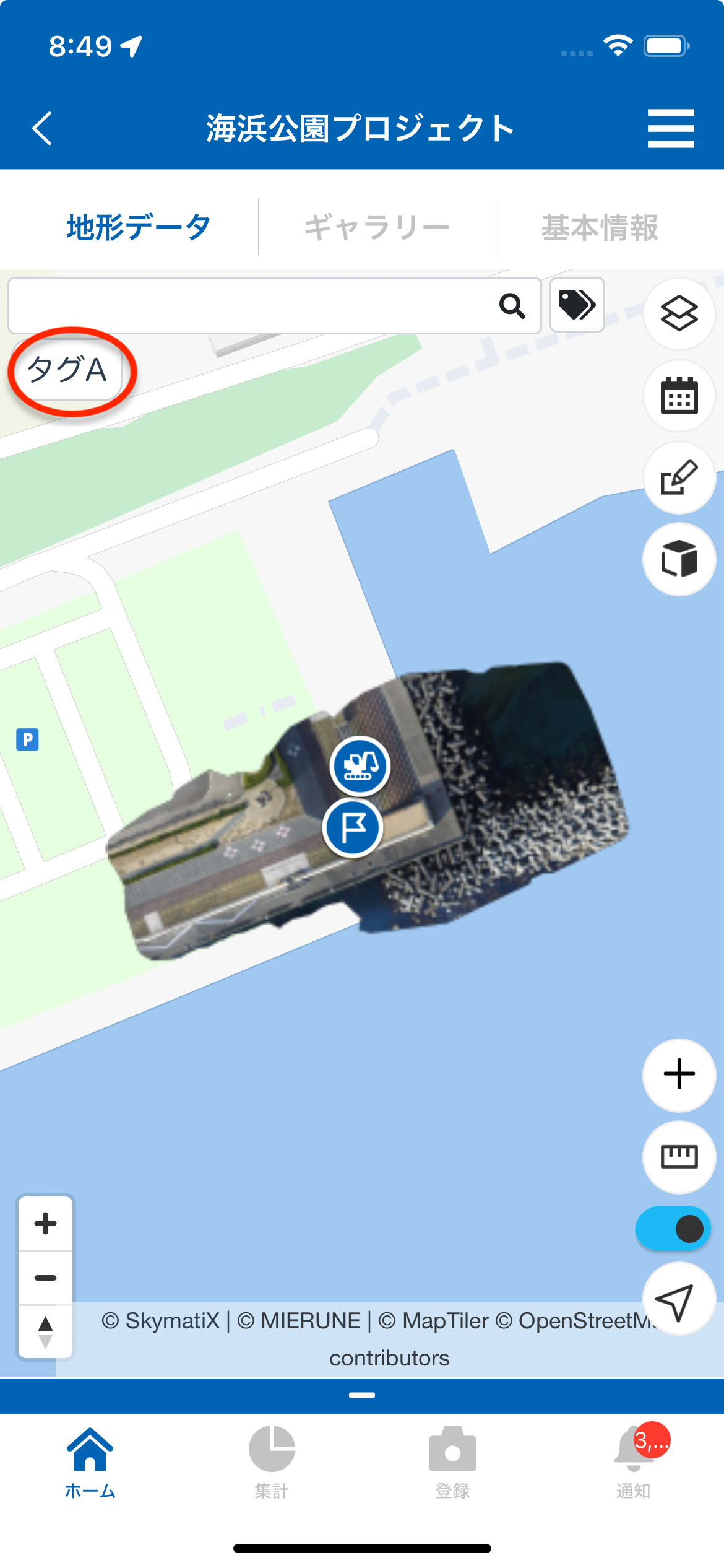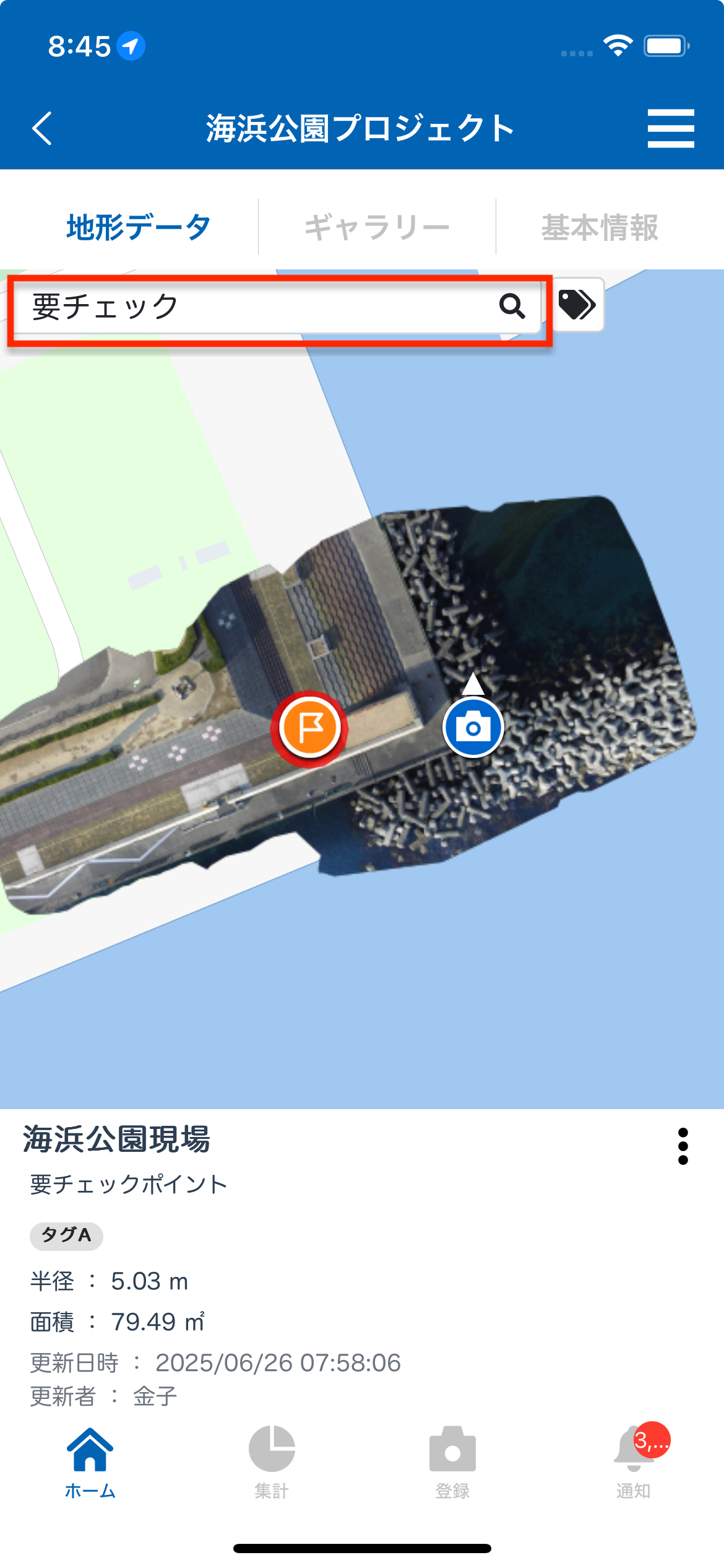 各種コンテンツ(写真、動画、現場管理*1、テクスチャ・パノラマ*2)を「フリーワード」「タグ」「コンテンツの撮影年月日*」で検索します。