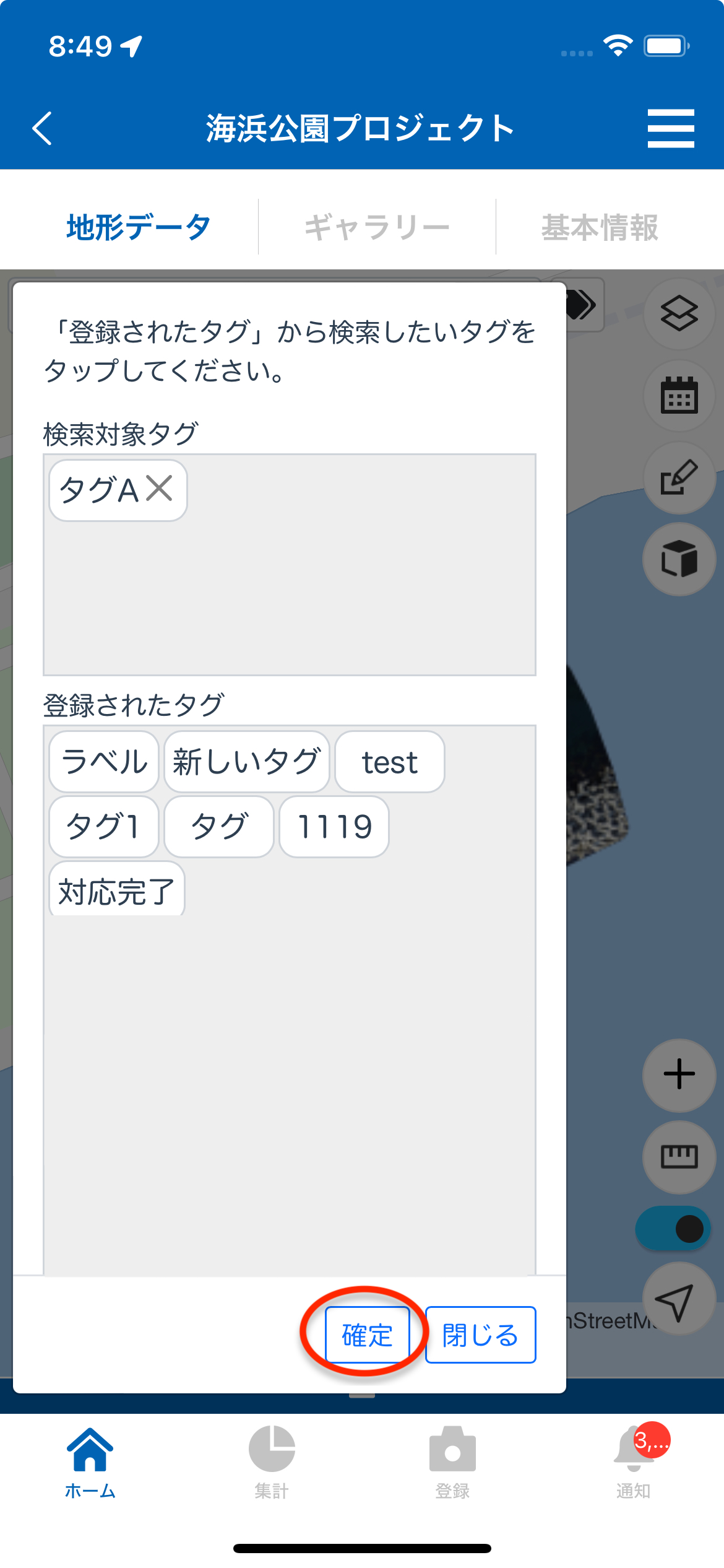 登録されたタグから検索したいタグを選択し、確定をタップします。タグを複数選択した場合はOR検索となります。