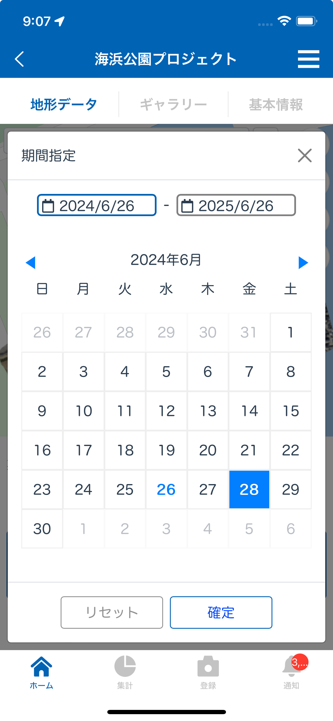 カレンダーアイコンをタップします。期間指定をタップし、開始(任意)と終了(必須)を指定し確定をタップします。開始の入力を削除したい場合はリセットをタップします。