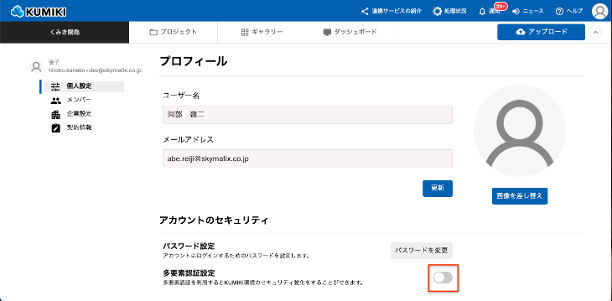 2. 左側メニュー「個人設定」を開き、多要素認証を「ON」とします。
