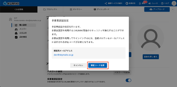 3. 多要素認証設定ダイアログに表示されたメールアドレスを確認し、「認証コード送信」ボタンをクリックします。