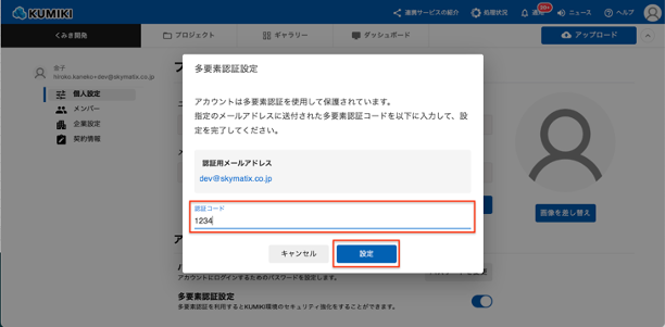 メールに記載されている、認証キーを「多要素認証コード」欄に入力し、「設定」ボタンをクリックします。