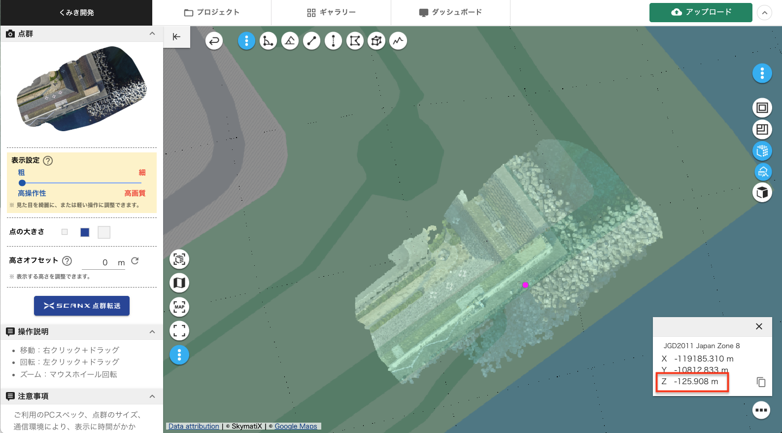 2.高さオフセットを入力し地上より上に3D点群が配置されるようにするとズームアップが可能となります。