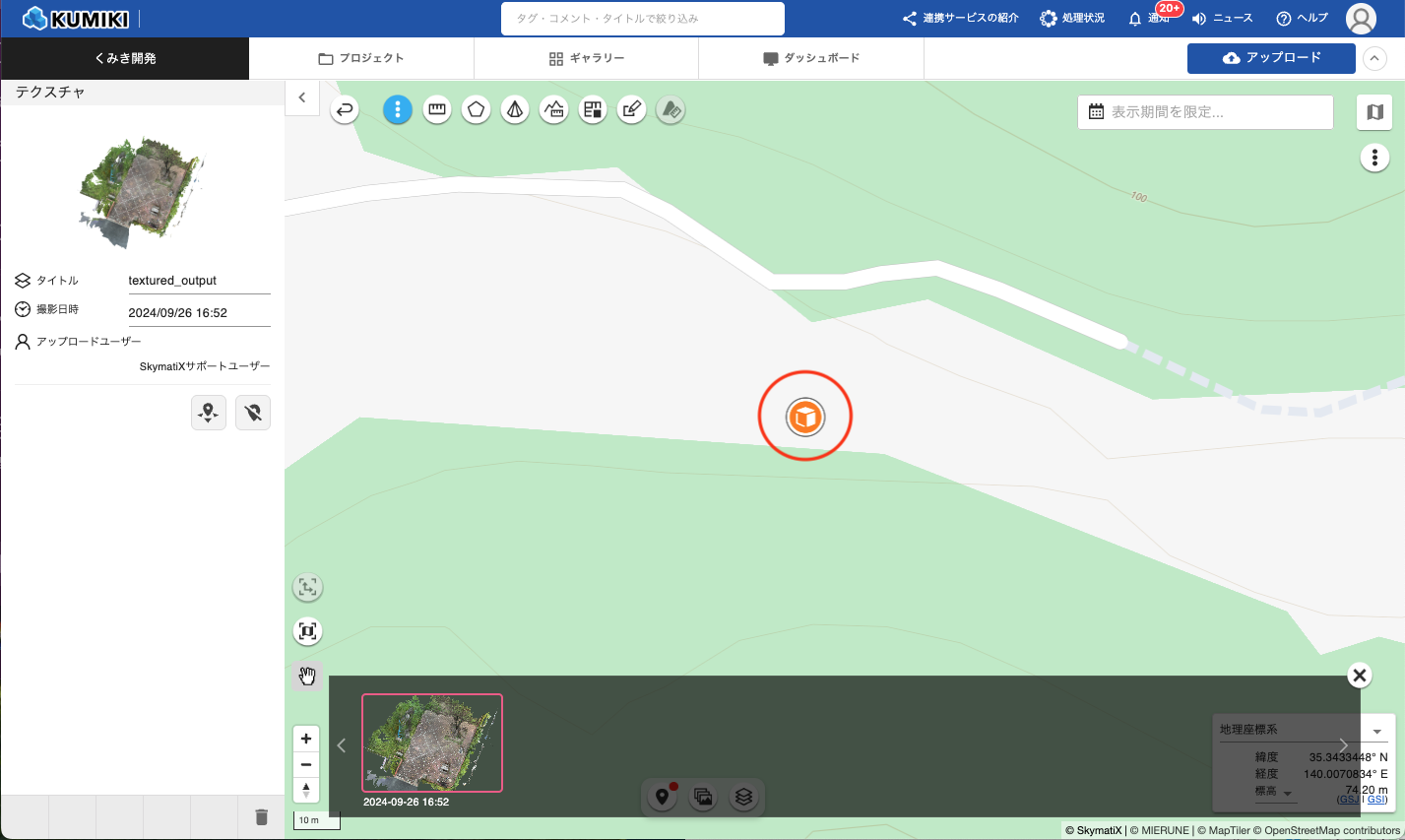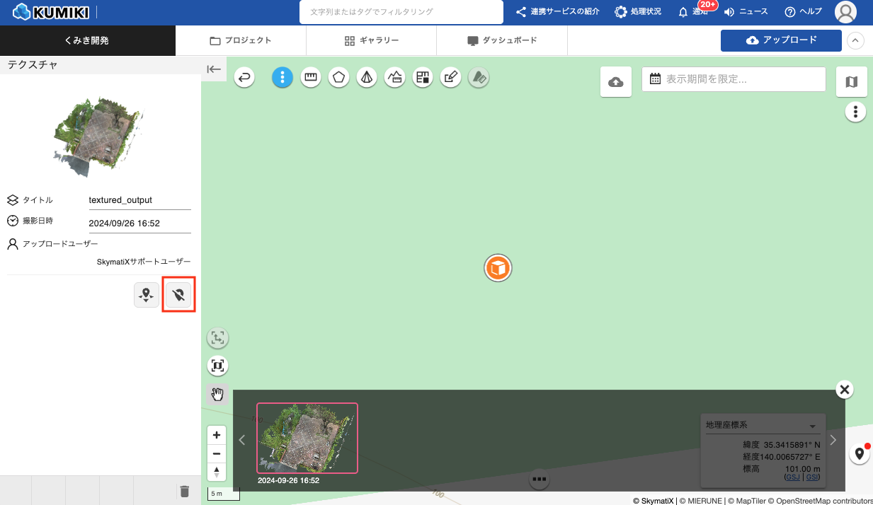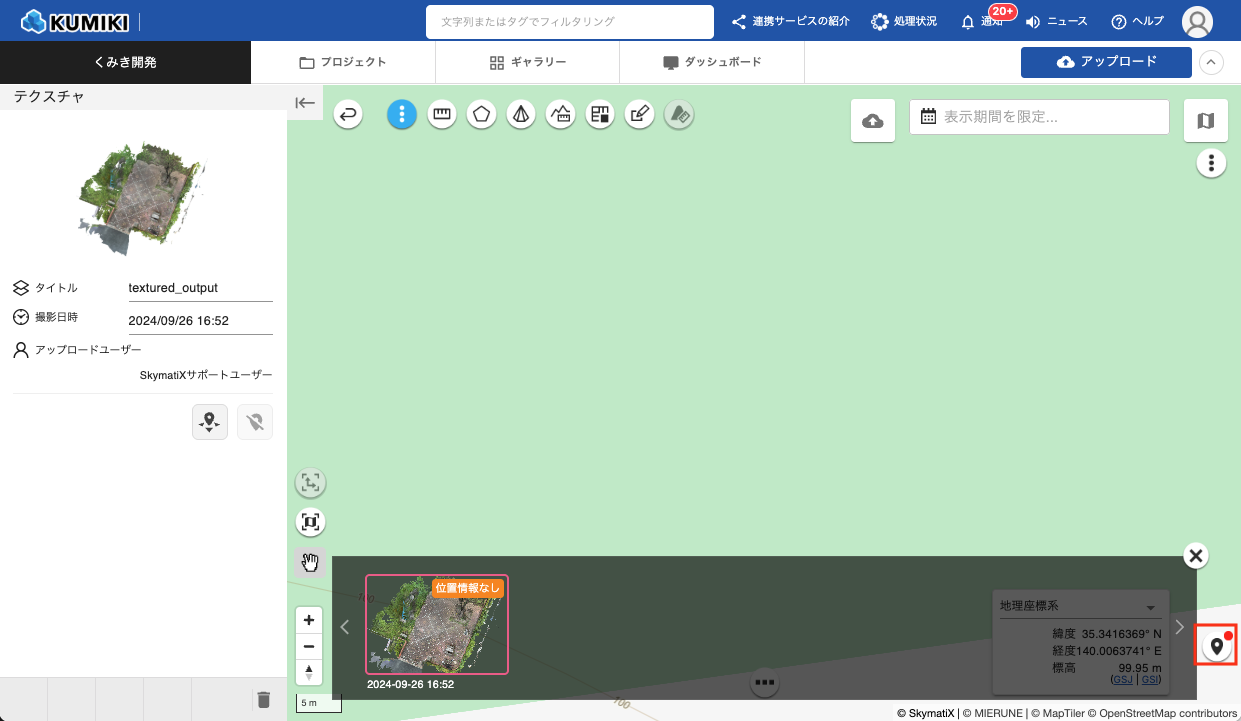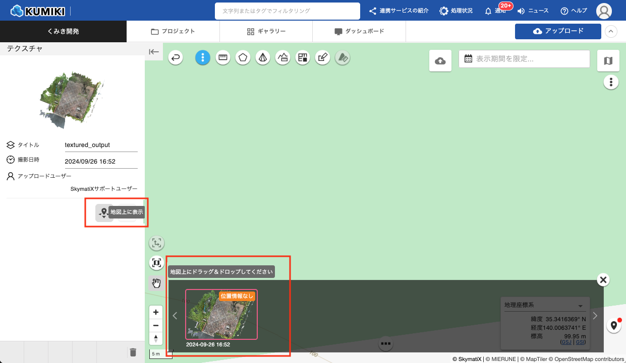 インポートしたテクスチャデータは位置情報が含まれておらず、地図上に配置されていないため、手動で位置情報を登録する必要があります。