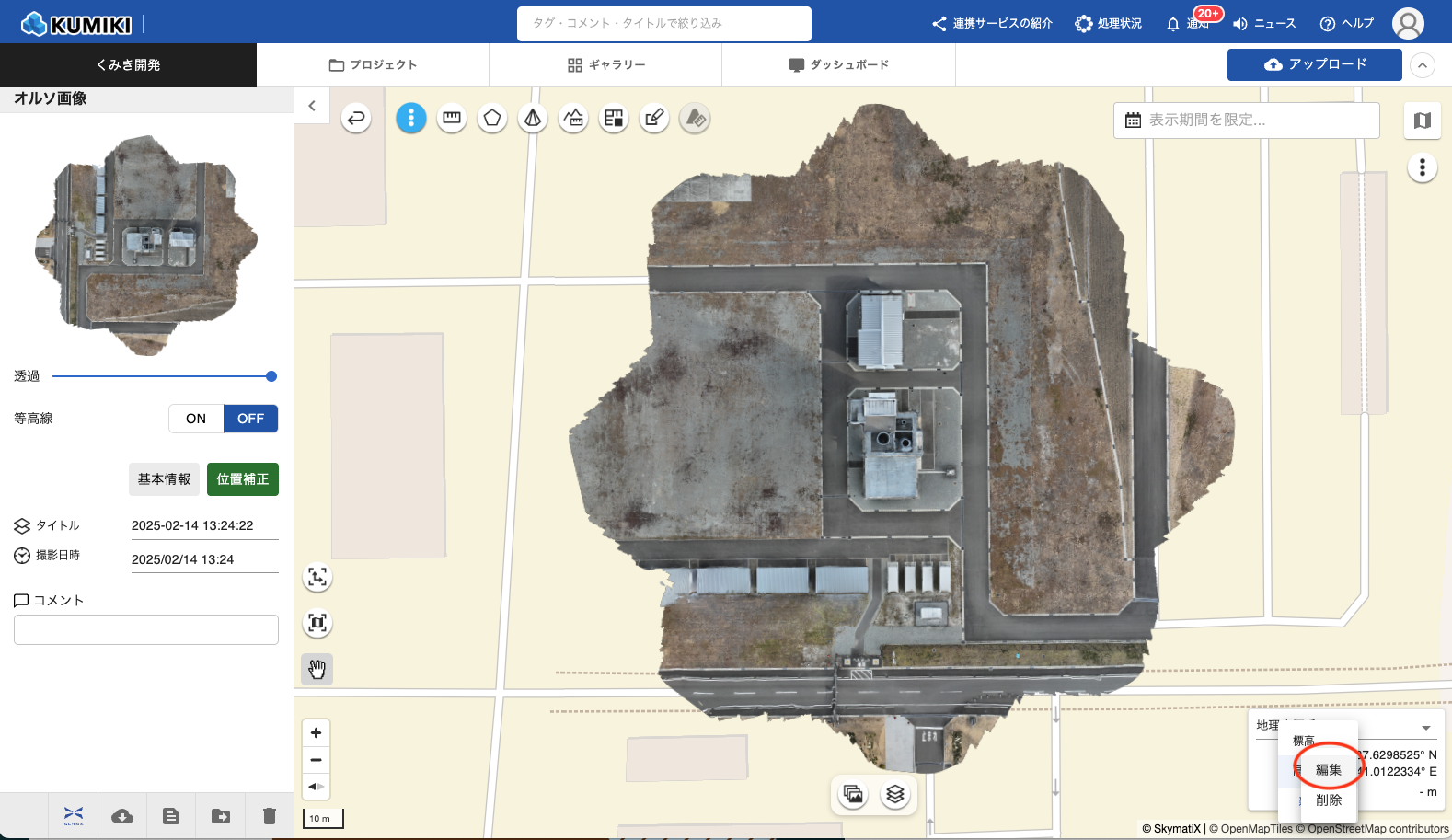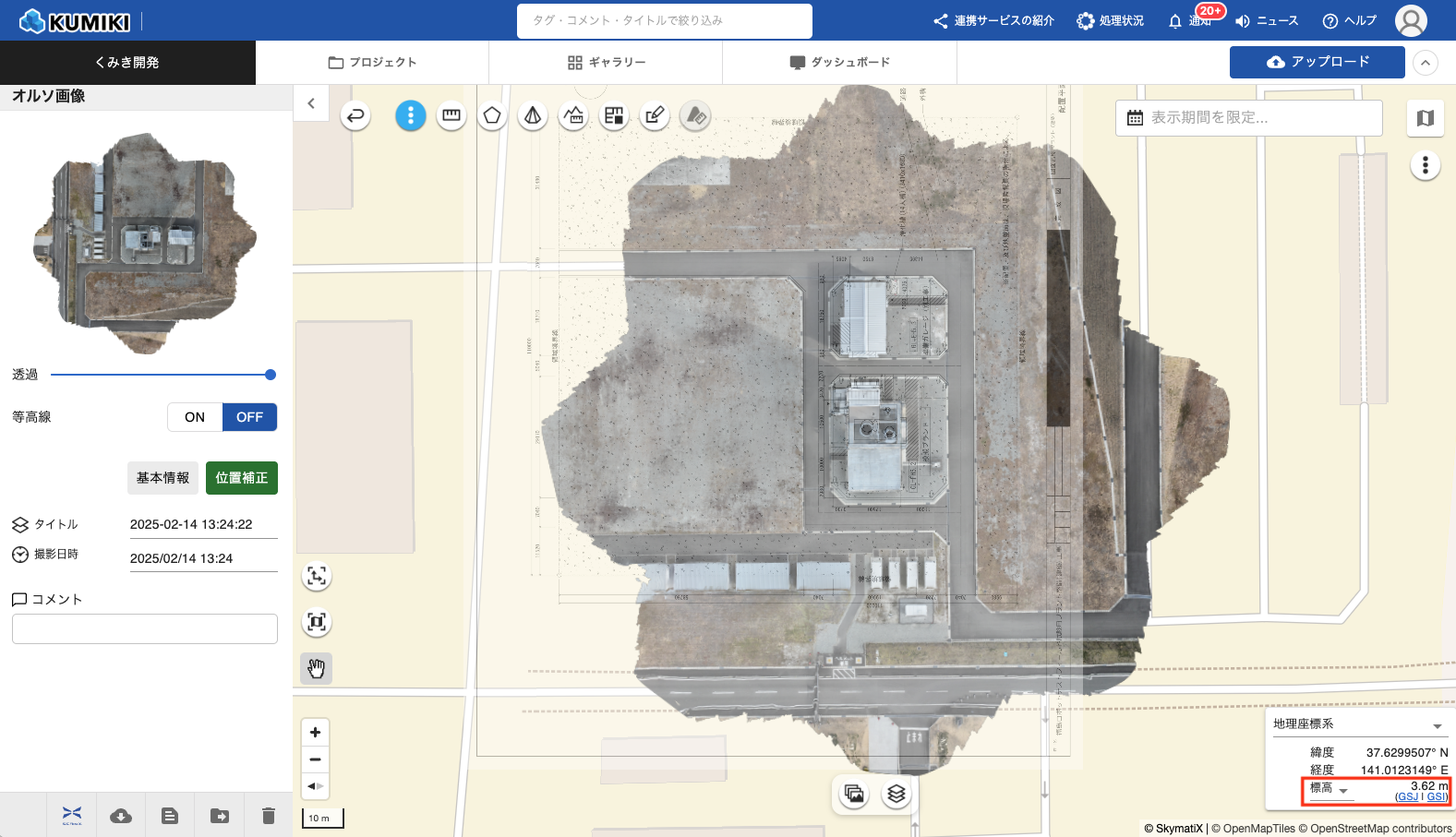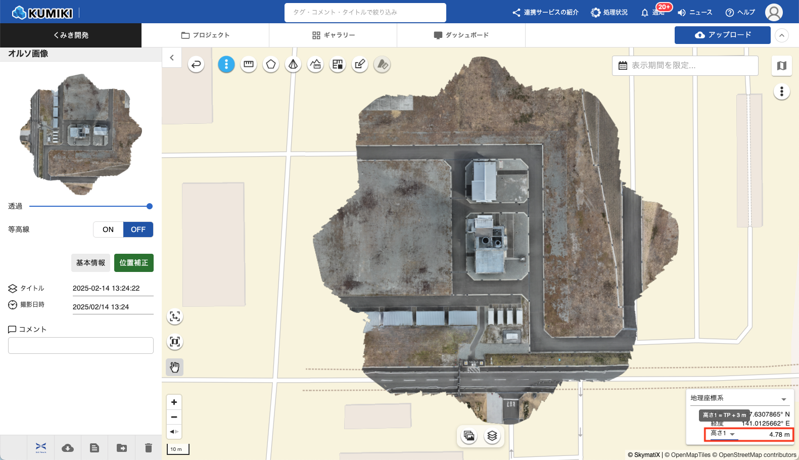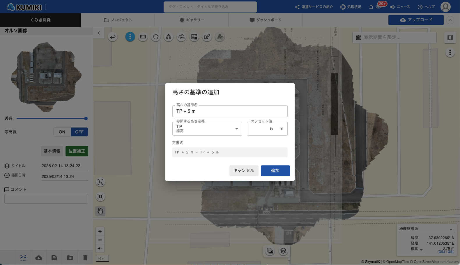 プロジェクト詳細画面の座標値パネルで表示される標高値に対して、任意の「高さの基準」を定義し、切り替えて表示することができます。