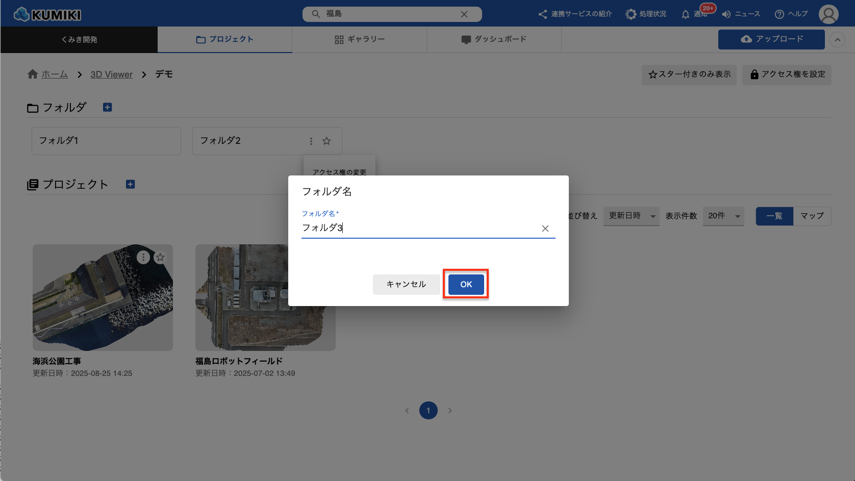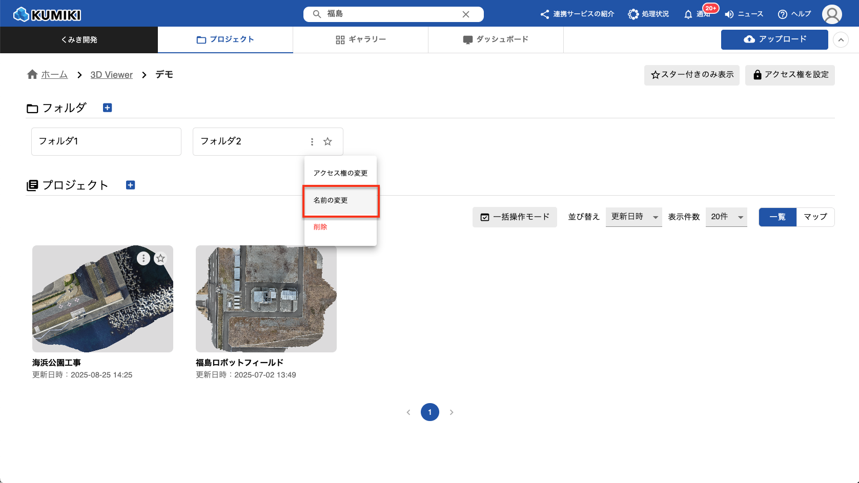 フォルダ名の変更 2025年08月28日 07:17 更新 1.変更したいフォルダの右上に表示されている「︙」をクリックし「名前の変更」を選択してください。 2.新しいフォルダ名を入力して、「OK」をクリックしてください。フォルダ名が変更されます。 関連記事 フォルダの新規作成 フォルダの移動
