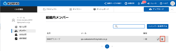 ユーザーを削除したい 2025年08月28日 02:32 更新 1.トップ画面の右上アイコンから「マイアカウント」をクリックします。 2.左側メニュー「メンバー」を開き、削除したいユーザーの右側にあるゴミ箱マークをクリックして削除してください。