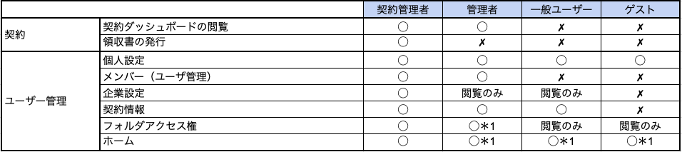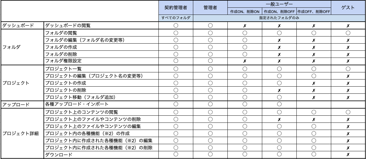 権限によってどのような操作ができますか 2026年02月23日 04:45 更新 権限の付与「契約管理者」及び「管理者」は、フォルダごとに各ユーザーに対してアクセス権の付与ができます。(「管理者」自身が指定されたフォルダのみ設定可能)また「一般ユーザー」に対しては、プロジェクトやファイルなどの「作成」「削除」の制限を任意設定できます。 権限で許可される操作(◯:可能 ✗:不可)※1 権限が与えられたフォルダを対象とする 関連記事 アクセス権限を付与したい ユーザーの種別とは ユーザーを追加したい 【位置補正】位置のずれを補正する(オルソ) どのように撮影すれば良いですか?