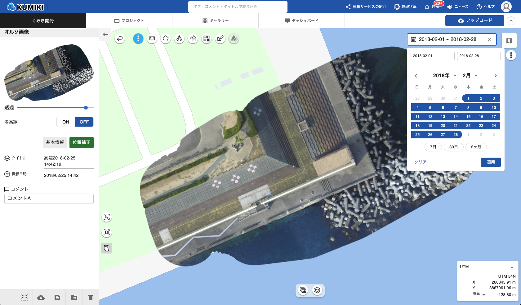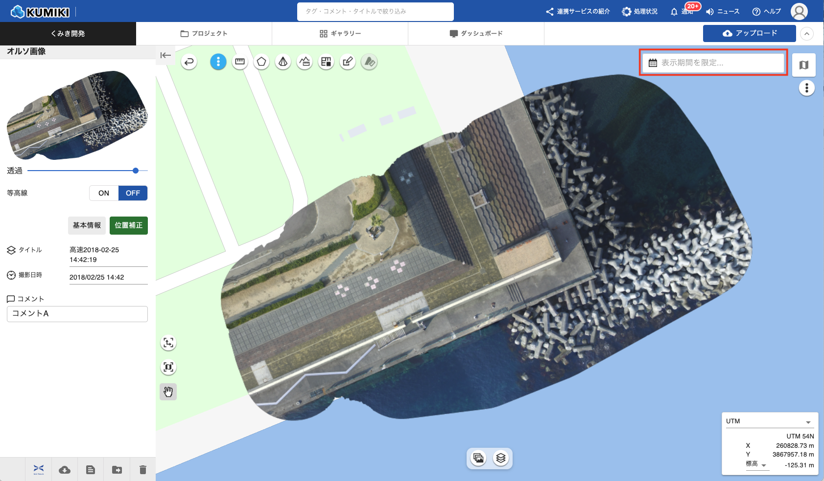 プロジェクト詳細画面で、コンテンツ(オルソ、写真、動画、パノラマ、テクスチャ)を撮影日で絞り込むことができます。特定の期間のデータのみを表示したい場合にご利用ください。